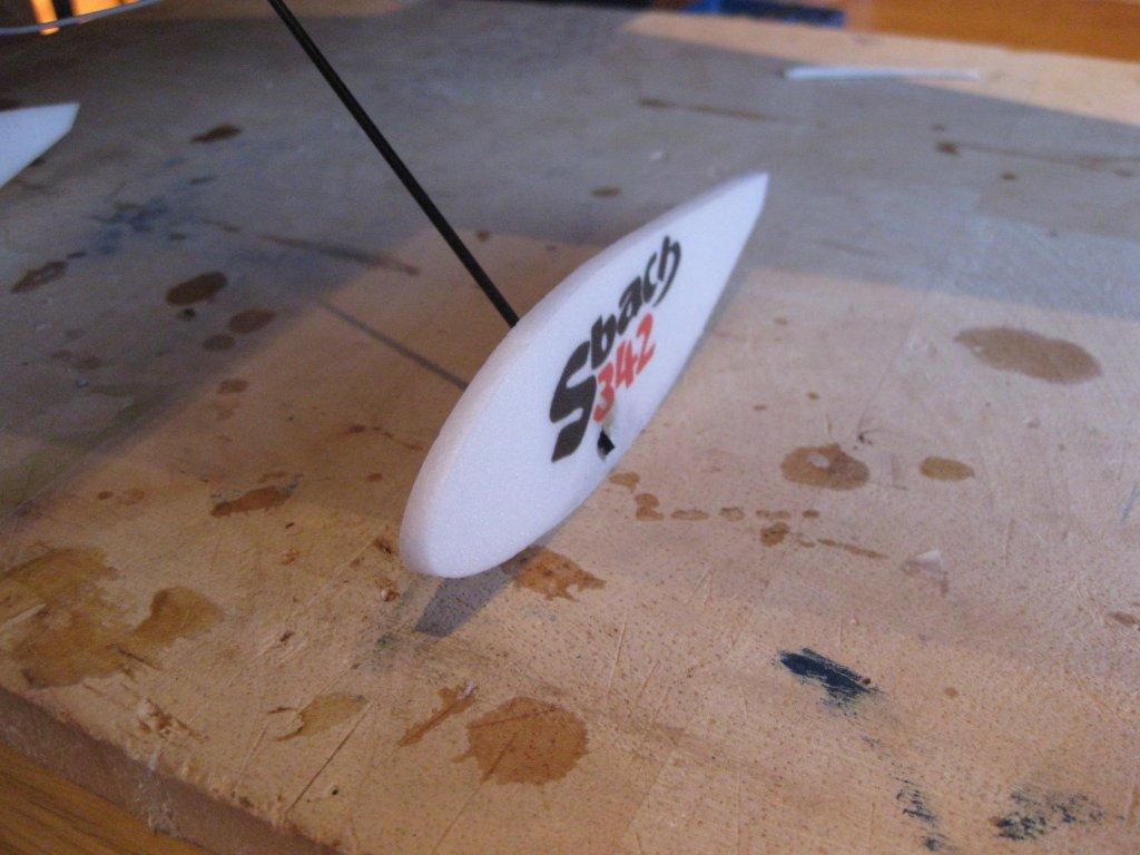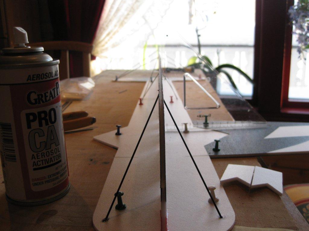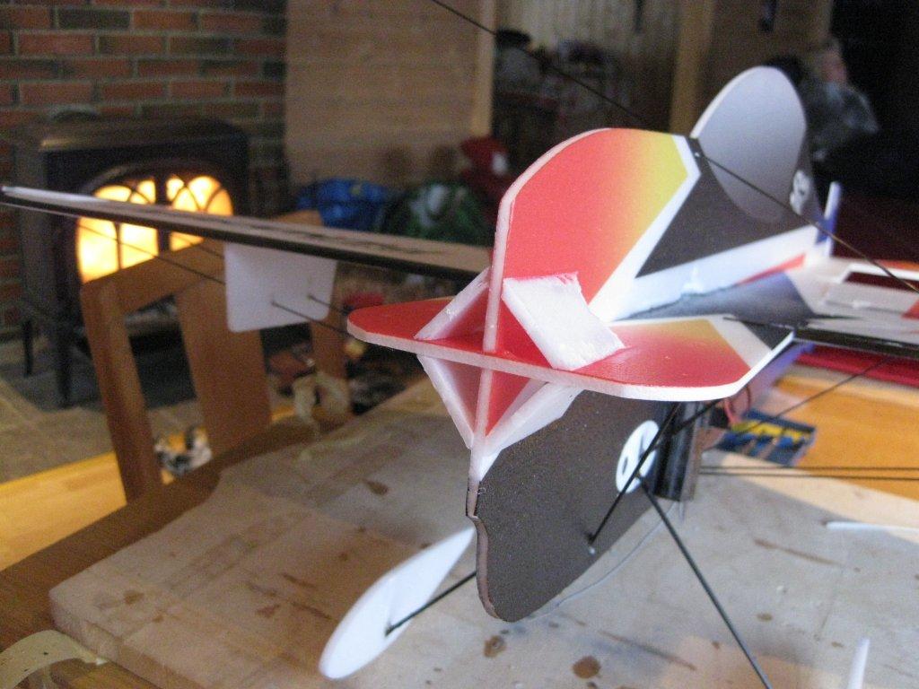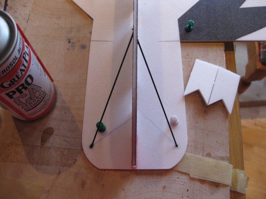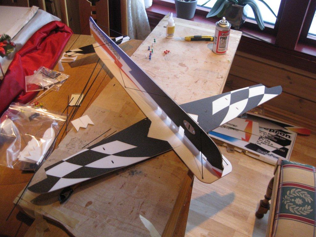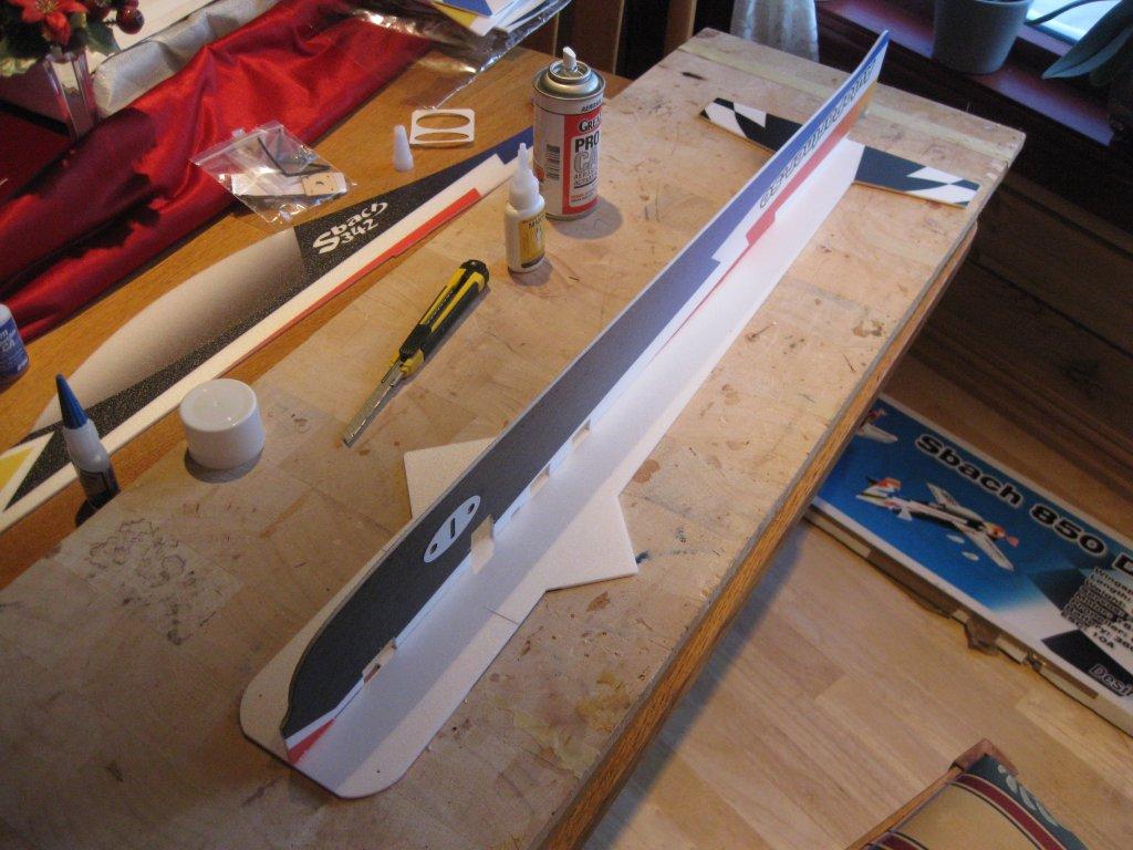 Jeg festet midttdelen av kroppen i plata(pass på så det blir riktig vei) og limte underdelen på plass. var litt usikker på hvilken carbonstenger som skulle hvor, så jeg har brukt de tynneste til støtte på vingene, til støtstenger og på midten av kroppen. De litt tykkere har jeg brukt til avstiving av stab,sideror og 2 stk biter fremst på kroppen. De flate stengene er til fremkant på vinger og en kort flat til avstiving av høyderoret.