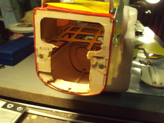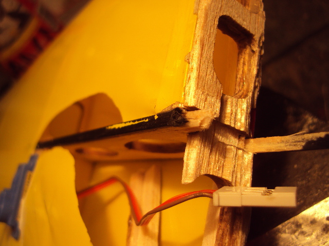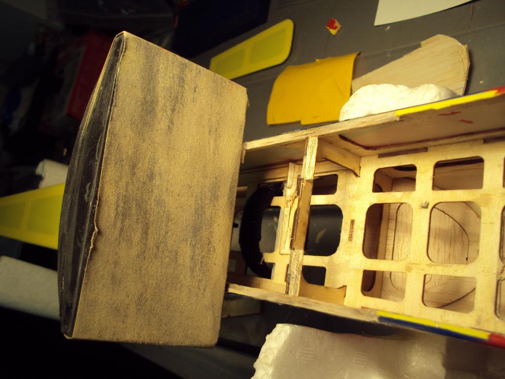 Før motorspantet limes inn er det nok en fordel å reparere den horisontale kryssfinerforsterkningen som går gjennom midten av kroppen. Batteriet og mottakeren skal festes til kryssfinerforsterkningen.