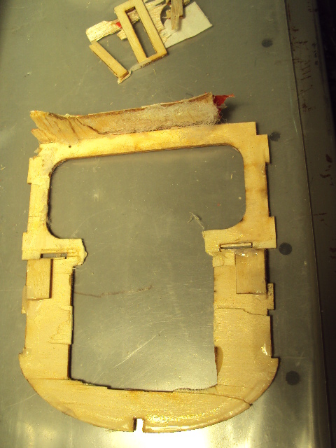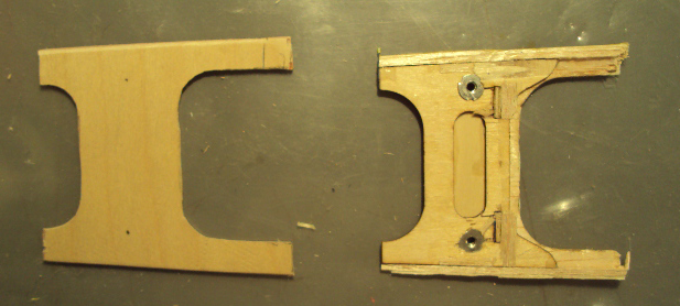 Tenker jeg lager ny kryssfinerplate av skikkelig flyfiner og lager plata noe større enn originalt for å få en større limflate mot kroppssidene av balsa. Det viser seg at den originale kryssfinerplata setter veldig godt og jeg sliter med å skjære den løs uten å ødelegge kroppssidene.