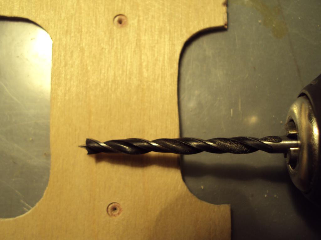 Først borres bare så dypt at kun spissen på boret går helt gjennom kryssfinerplata. La boret gjøre jobben, ikke bruk for stort press på drillen. Bruker borstativ for å sikre at hullet ikke blir skrått.