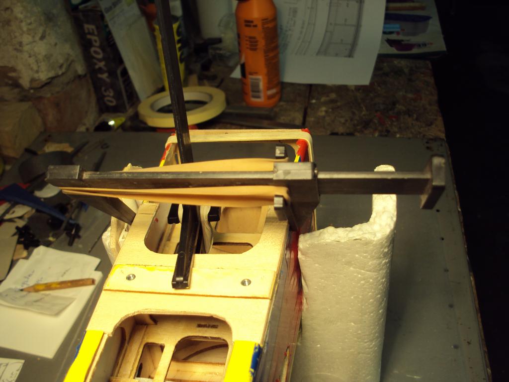 Velger å bruke hvittlim/snekkerlim. Det er litt seigt selv etter at det har tørket og min erfaring er at det har bedre holdbarhet enn moderne CA-lim, som blir helt hardt og sprøtt. Kroppssidene forover er veldig fleksete og jeg setter inn motorspantet provisorisk med strikk rundt for å holde dem i rett posisjon til limet er tørt. Tvinger på strategiske steder holder delene i press mens limet tørker.