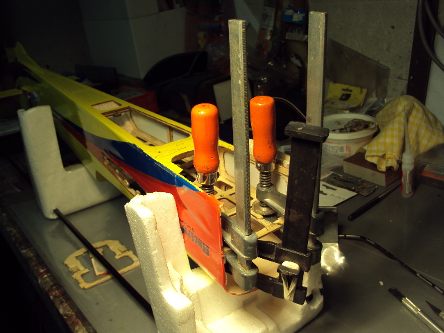 Det blir enklest å reparere kroppen først, deretter ene vingehalvdelen med ekstra forsterkning på midten, samle kropp og vinger og til slutt lime på nye hengsler til begge halvdelene av høyderoret.