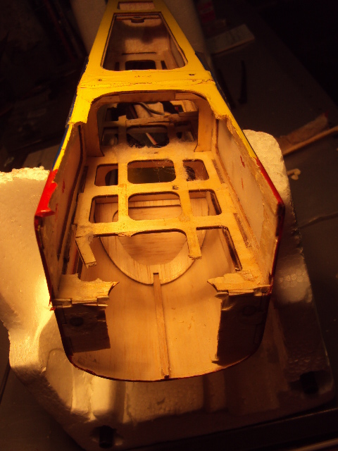 Tradisjonellt laget vi kroppssidene med kryssfinerforsterkninger på innsiden - fra motorspantet til spantet foran vingen - til nitrofly. Her er det kun balsa og det er skåret store huller i kroppssidene for å lette modellen. Det har holdt bra!