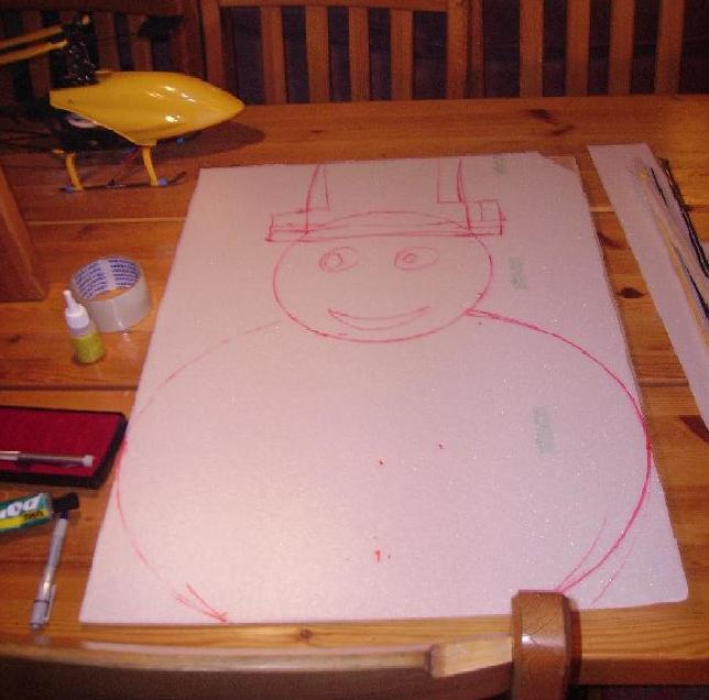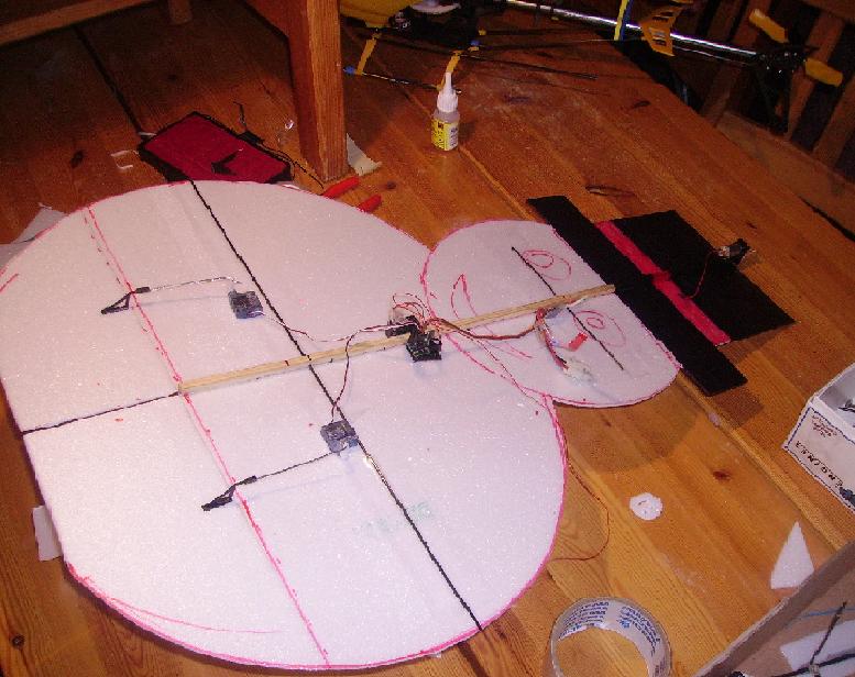 Snømannen ble raskt tegnet på en depronplate og kuttet ut. Litt utstyr fra noen "gamle" prosjekter ble skaffet.... og etter omtrent 2 timer var det liv i snømannen min, i aller fire kanalne faktisk...