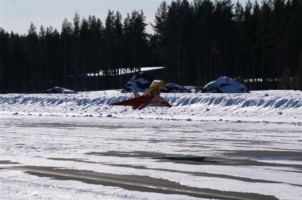 Fullt høyderor, og ballanser med gassen. 20 grader avvik på ballanse, tar to sekunder å rette opp, men aldri noe skumle tendenser,. Når den flyr sånn, er det ca 30-40 km/h. Den står på skyvekrafta, så å si.