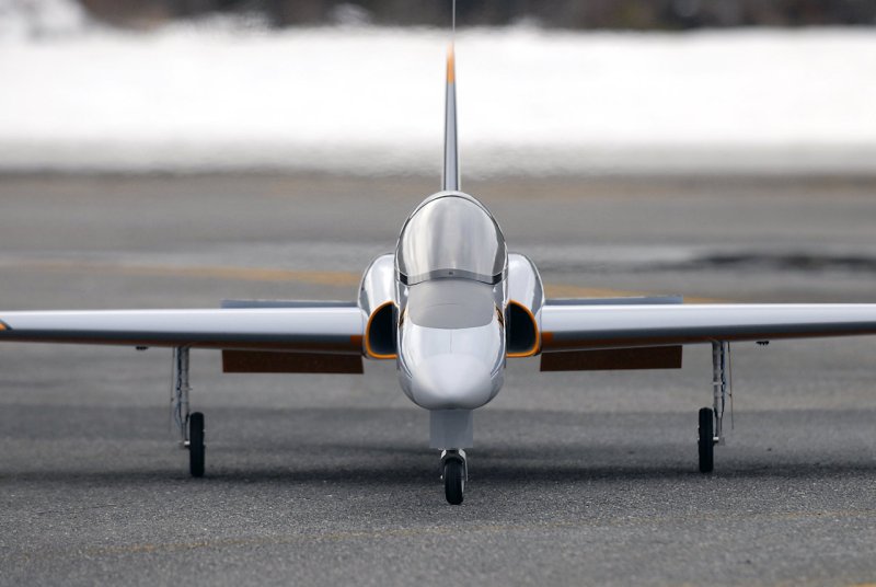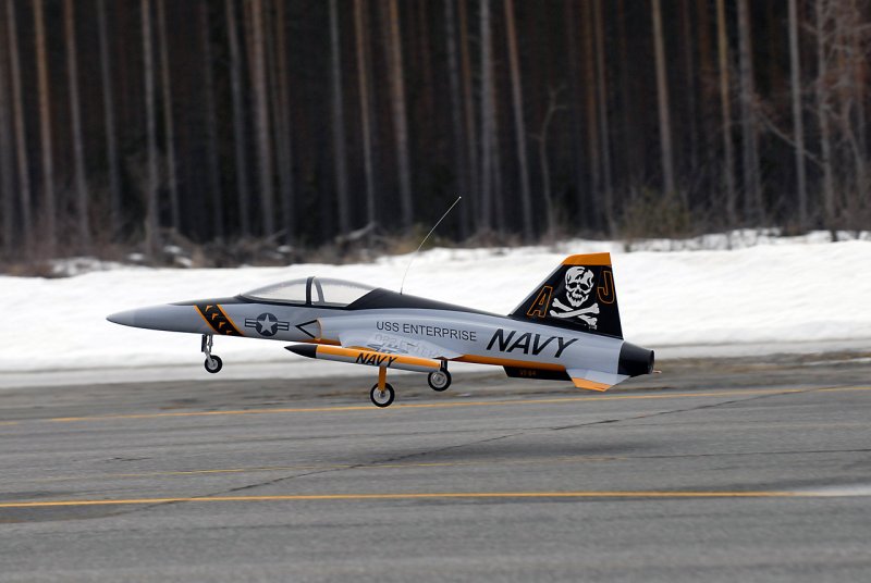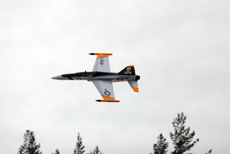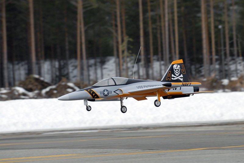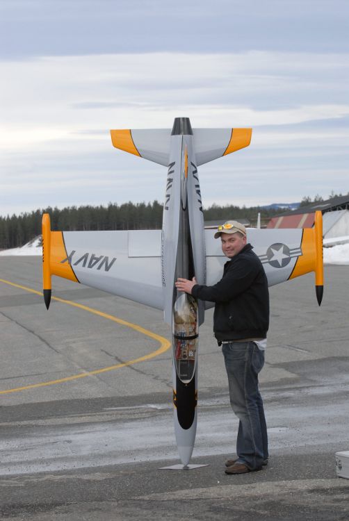 Modellen ble innkjøpt i fjor høst og byggingen startet rett før Jul. Utover høsten ble det jeg trengte av utstyr innkjøpt. Elektroniske ventiler, sequencer til understellsluker og en bråte med JR 8611A servoer fra USA. I slutten av Januar var den ferdig bygget, men mye dårlig vær og mangel på muligheter gjorde at jomfruturen først ble nå. Dette er en stor maskin. Vekten ble 17,5 kg tørr, så med over 6 liter fuel og evt 2 liter røykveske vil maks take-off vekt bli nesten 25 kg. Modellen måtte da registreres som stormodell hos NLF. Lengden er 2,60 lang og 2,10 V.sp. Motoren hadde jeg fra før og er en Merlin 160 med ca. 17 kg. thrust på 118.000 o/min.