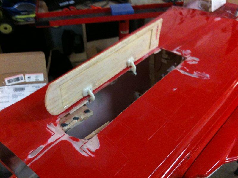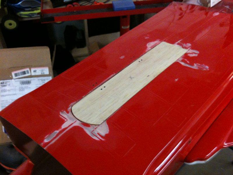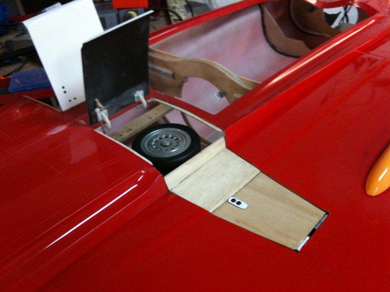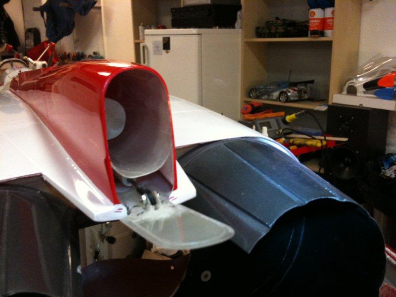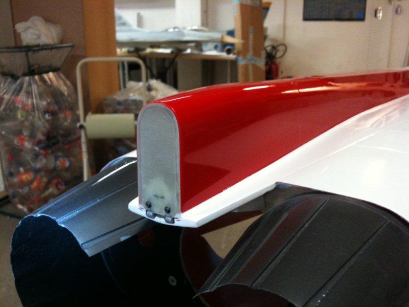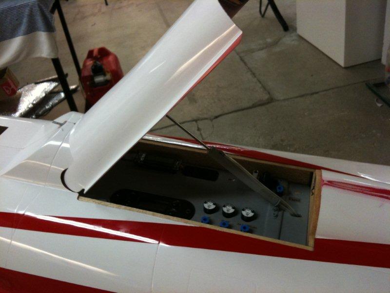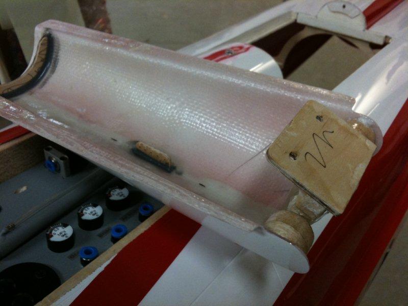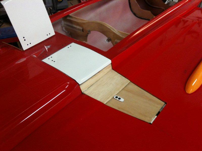 Før jeg skar ut luftbremsen støpte jeg litt skikkelig oppunder taket i kroppen med grov duk for å forsterke og stive opp kroppen. Hengslingen har jeg laget sånn at jeg kan skru av hele luken med kun to 3mm skruer, dette forenkler jobben veldig om man trenger å komme inn i flyet ved montering av utstyr og spesielt tankene.