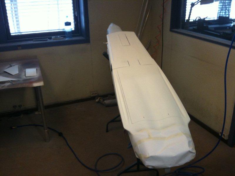 Etter å ha pusset, sparkla og grunnet var det tid for lakkering. Valgte gråhvit under flyet.