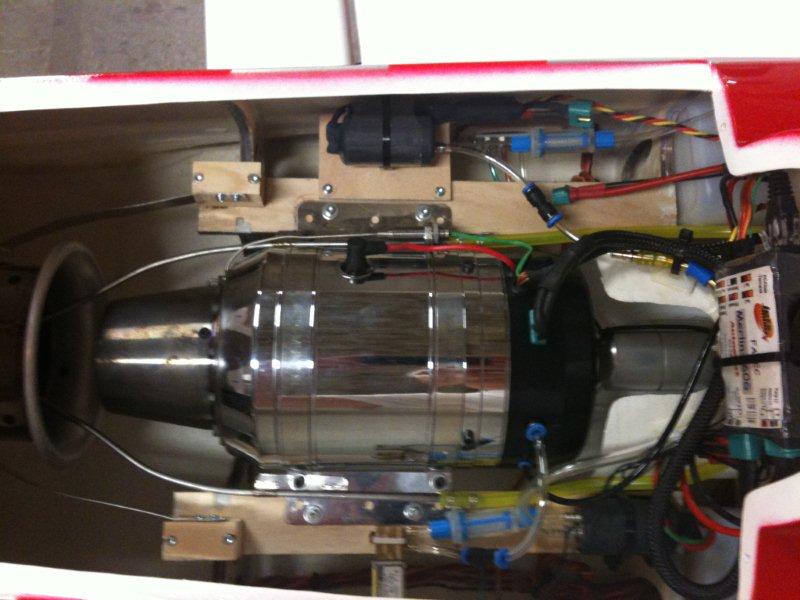 Nå står kjerra ferdig, kun litt programering igjen. Vekten kom ut på 15kg, og med da 1,5 kg med batterier helt fremme i nesa balanserte den der den skulle. Med fuel og røykolje er da vekten litt over 20kg.