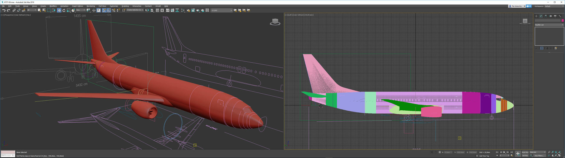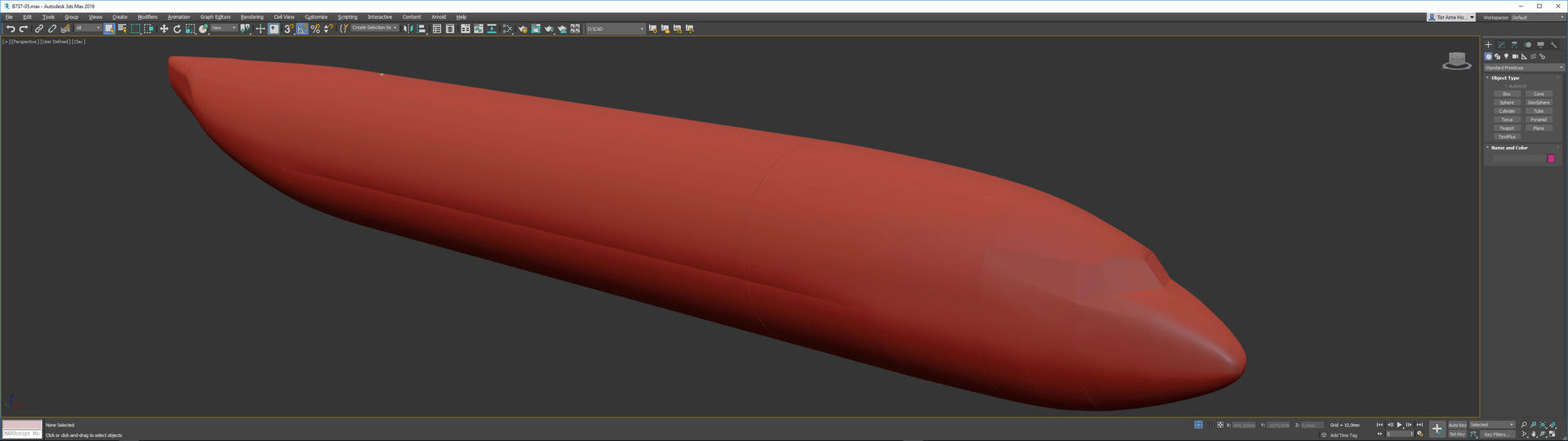 Jeg følte behov for å lage noe annerledes så jeg prøver å designe en stor Boeing 737-800. Det er faktisk veldig vanskelig å tegne disse flyene riktig, men jeg gjør mitt beste. Målet er en relativt lett modell på under 9 kg og to 120 mm EDF matet av hver sim 6S lipo. Jeg printet et 20 cm langt teststykke av skroget og det veier bare 72 g og er overraskende sterkt med støttering i begge ender. Bredde 250 mm og høyde 268 mm. Det vil være lite behov for intern struktur på grunn av den jevne runde formen. Eneste untak er i skjøten mellom kabon og bagasjerom i profilen, og kanskje noe eller avhengig av hva jeg trenger innvendig.