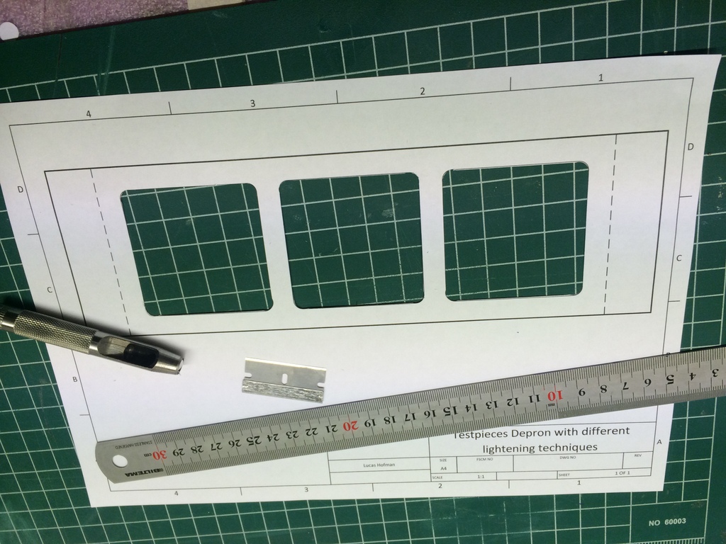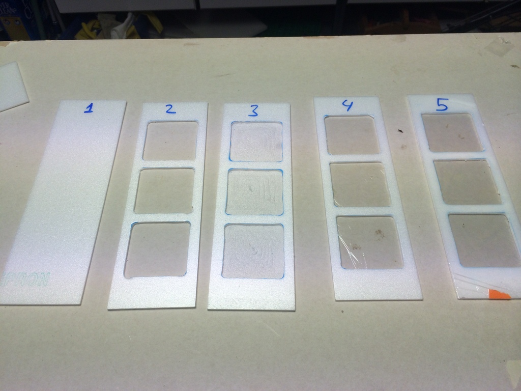 Tid for en liten test. Den pretenderer ikke å vær vitenskapelig, men gir forhåpenlig noe føring. Jeg har laget en del prøvebiter som bestar av en rektanger av 26x8 cm met 3 felter som lettes på forskjellige måter: