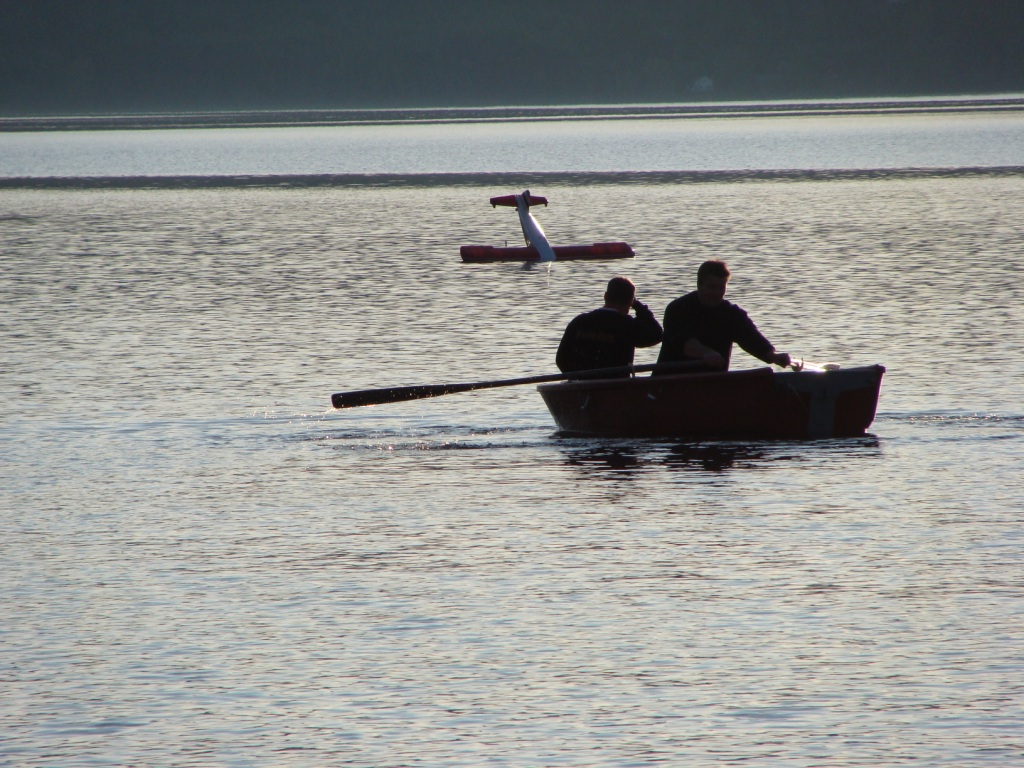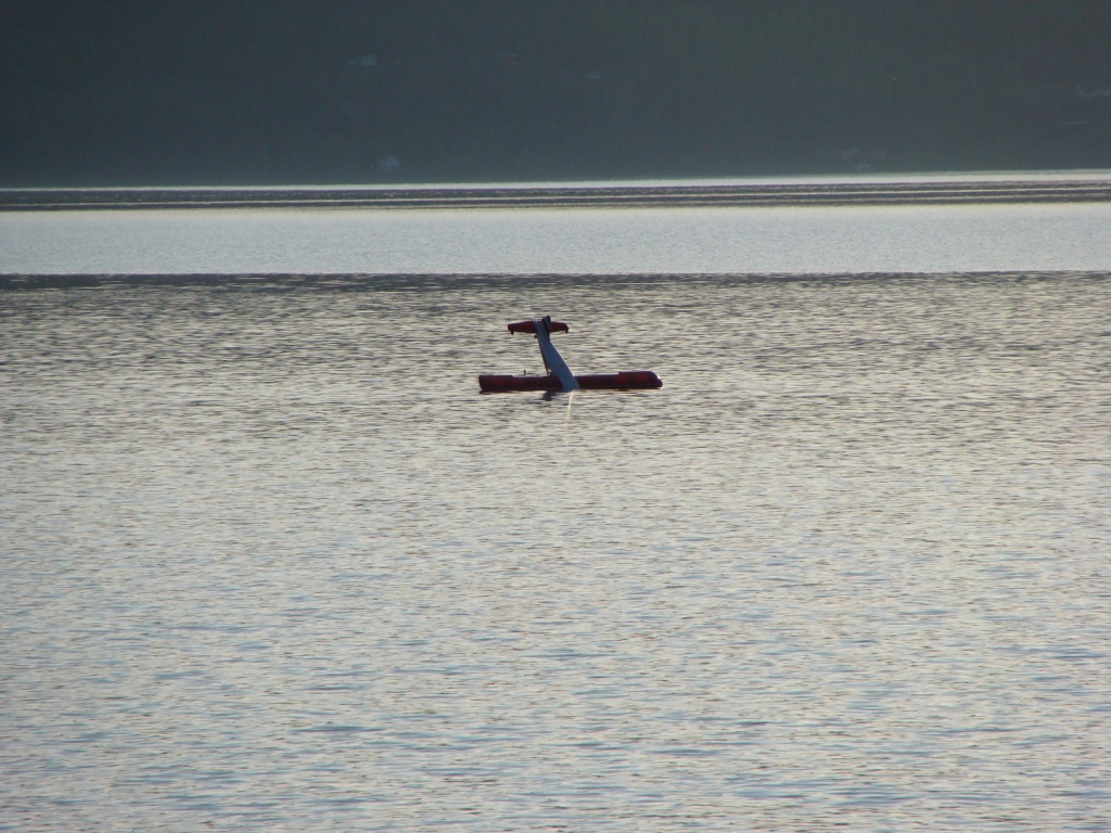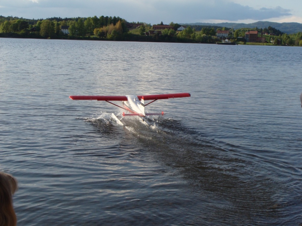 jeg hadde ikke kontroll i det hele tatt. fløy i 5-6 minutter. var vel tilfeldig at det var der den landet.jeg hadde gitt opp å lande den. cg er bra,men tror ene frontruten datt ut under take off da den traff en bølge hardt.vet ikke om luften inn i fly-kroppen kan påvirke dette?blåste også en del.ble 2 små hull i ene vingen.