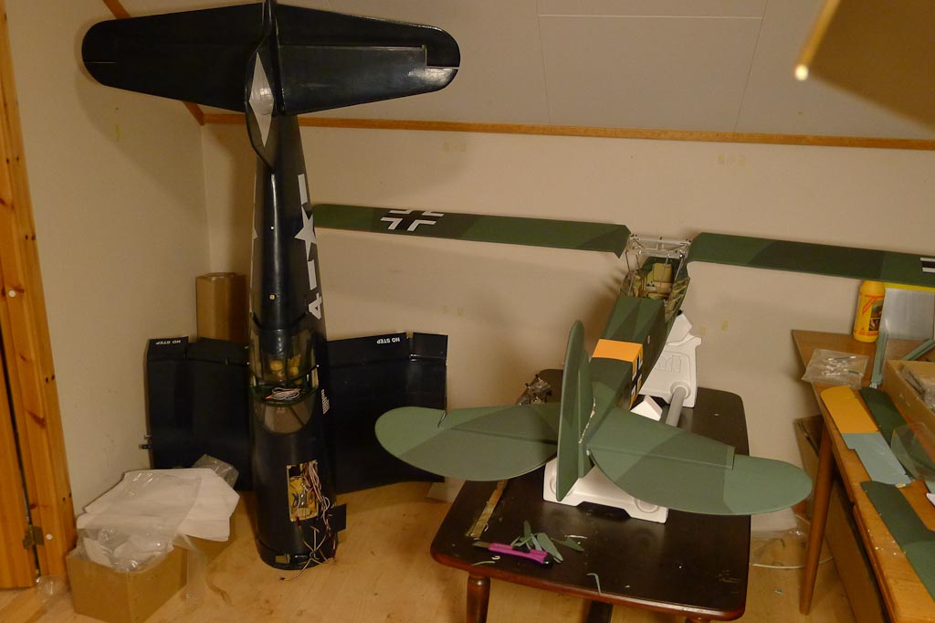 Så ble det julaften på ny. Moki150 er i hus fra Geir F. Løsningen på Corsairproblemet ble en ny cowl fra Nick Ziroli. Hans Corsair er litt mindre enn Marutakas store som har 2,65 vsp., men cowlen er større. F4U kom i flere utgaver med forskjellig cowl alt etter motorstørrelsen som egentlig var formidabel. Dessuten er Zirolis cowl flere cm lenger og det hjlper godt på cg. Andre har med utvidet originalcowl og Moki150 vært nødt til å legge inn mye bly framme. Det blir spennende å se hvordan dette går.