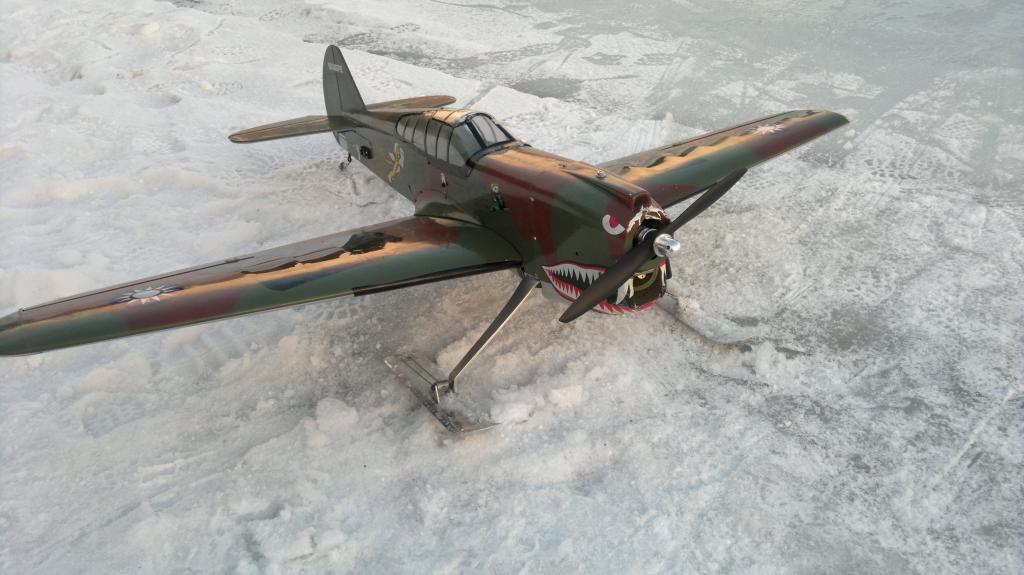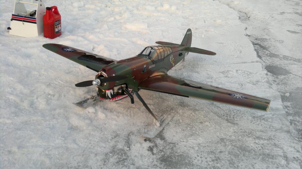 Jeg hae en P40 60 size av ukjent fabrikat vingesåennet er ca 165cm. Ble kjøpt brukt uten motor. Har montert en JBA 15cc bensinmotor i den og den flyr helt utrolig bra. Det var opprinelig opptrekbart understell på den men det fungerer dålig om en flyr på en litt ujevn gresbane, flyet stumper på nese for den minste hump når en kjører sakte på bakken og blir alergisk for lit harde landinger. Jeg fjernet hele understellet sjøte spantene og la betrekning over hullene i vingene. Så lagde jeg meg et nytt understell i 3mm aluminium og monterte forran vingen. Det er nokk i høyeste grad heligbrøde for skalafolket men det fungerer meget bra i praksis. Og sist men ikke minst nå kan jeg ha ski på flyet slik at jeg får brukt det også på denne årstiden. Dette er sikkert Norges styggeste kriksful men når gleden er og fly får nå heller det stå sin prøve.