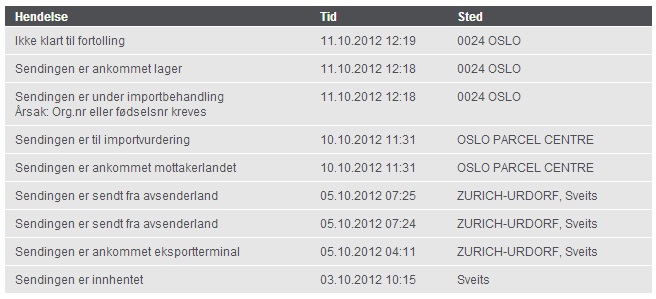 "ikke klart til fortolling" og "fødselsnr kreves"..