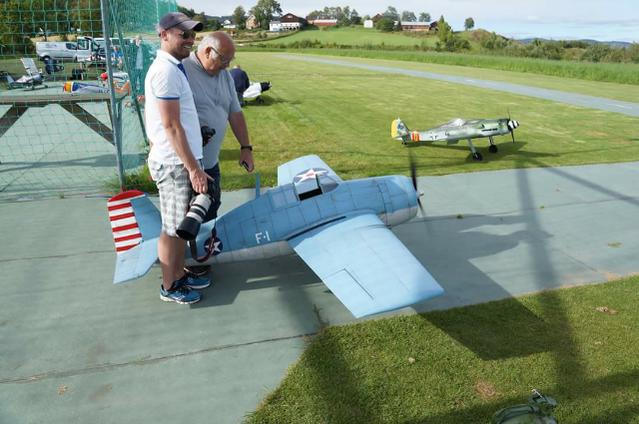 Har en eskeny P-47 med Saito 26 bensin mener jeg det var. Den skal guttungen fly.
