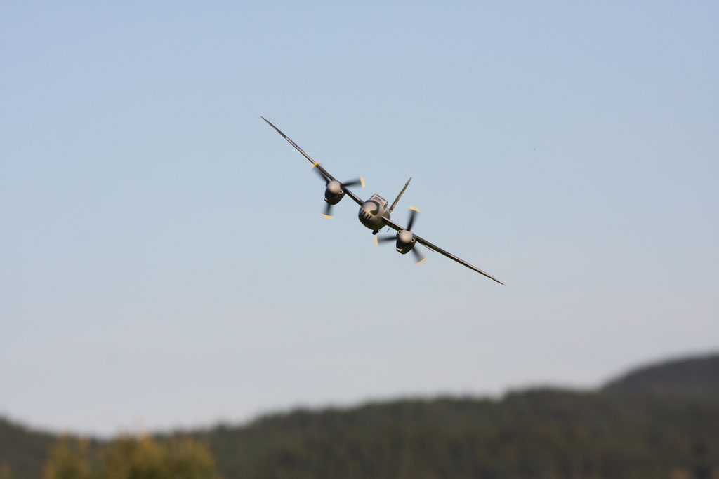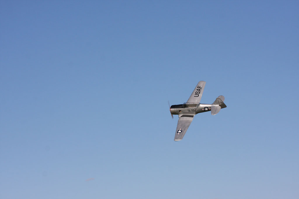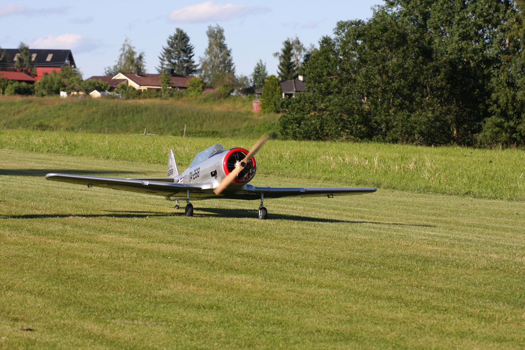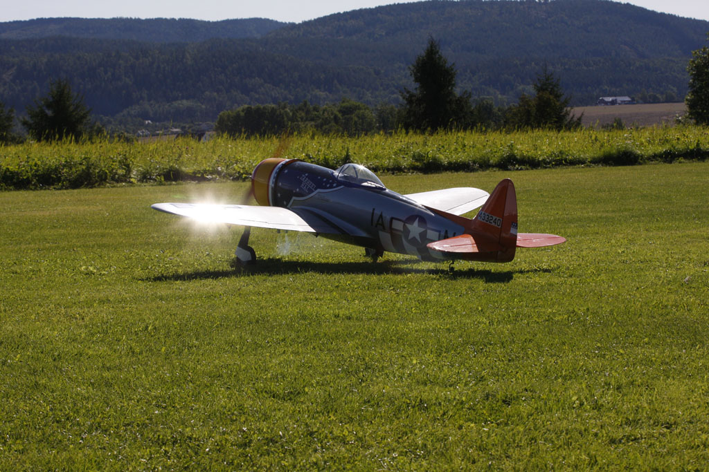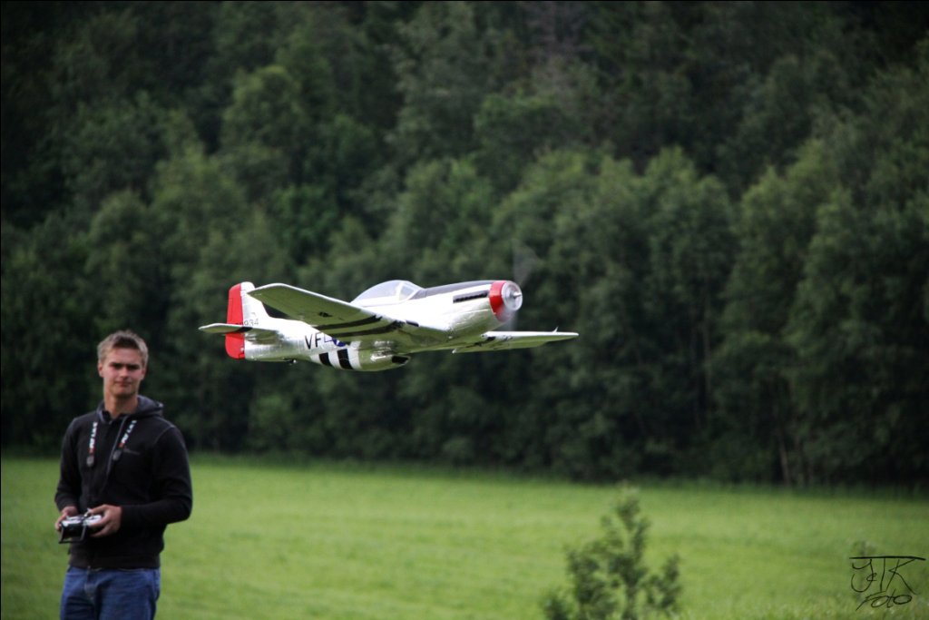 Må vel hive meg på å legge inn et bilde av min warbird. Ikke mer spennende enn en P-51. Billig EPO modell på 140 cm vsp. Fløy som en hval svømmer helt til jeg fant ut at støtstengene til høyderorene gikk tregt. Det førte til at rorene ikke gikk helt tilbake til nøytralposisjon når jeg tok stikka tilbake til midten. Altså ble det konstant slak sinuskurve når jeg prøvde å fly rett frem.