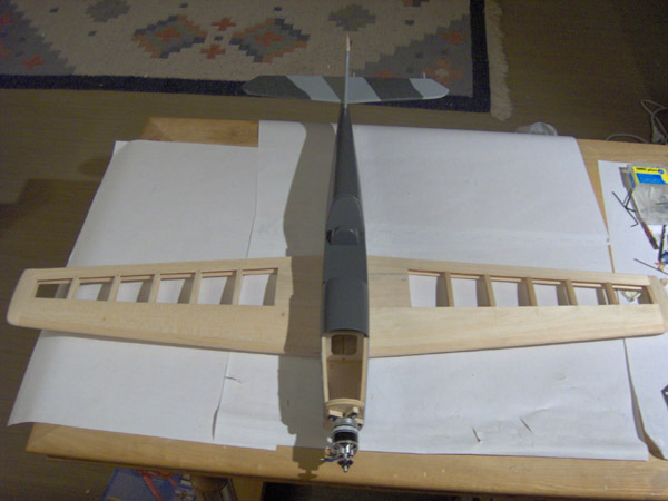 å ja. har nok litt å si det å...jeg har satt den så rett som mulig i forhold til kroppen, men men er ikke sikkert den er rett i forhold til vingen. og det er vel det som er det viktigste.. må gjøre ferdig vinge feste så jeg kan skjekke.., men skulle gå greit å rette opp stabben med de staga som skal på tenker jeg.