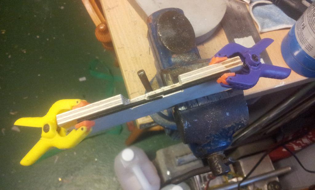 så en 2mm piano streng som ble bøyd til så den passet mellom hulla i a armen.