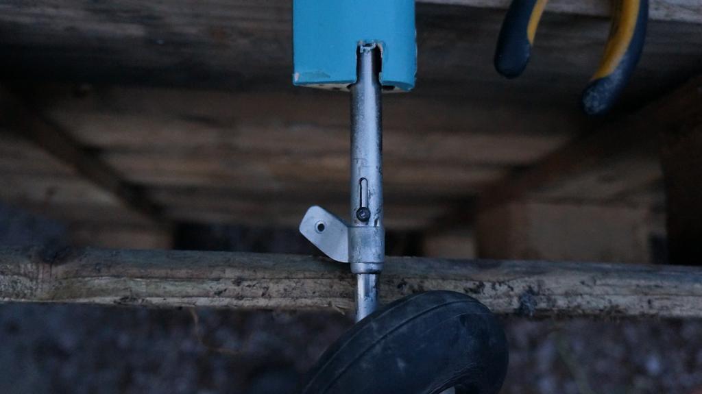 Spørs om jeg får til det da. understellet tålte ikke å stå på grusen her. når jeg løftet opp flyet så datt hele stanga som hjulet sitter på ut. Ser ut som det er en sett skrue som har skrudd seg ut, som skal hindre att det går for langt ut. Alt dette sitter limt inn i den tykke klompen på understellet selvfølgelig. men er ett lokk som er limt fast i hver ende, skal se om jeg får av det og få fikset det