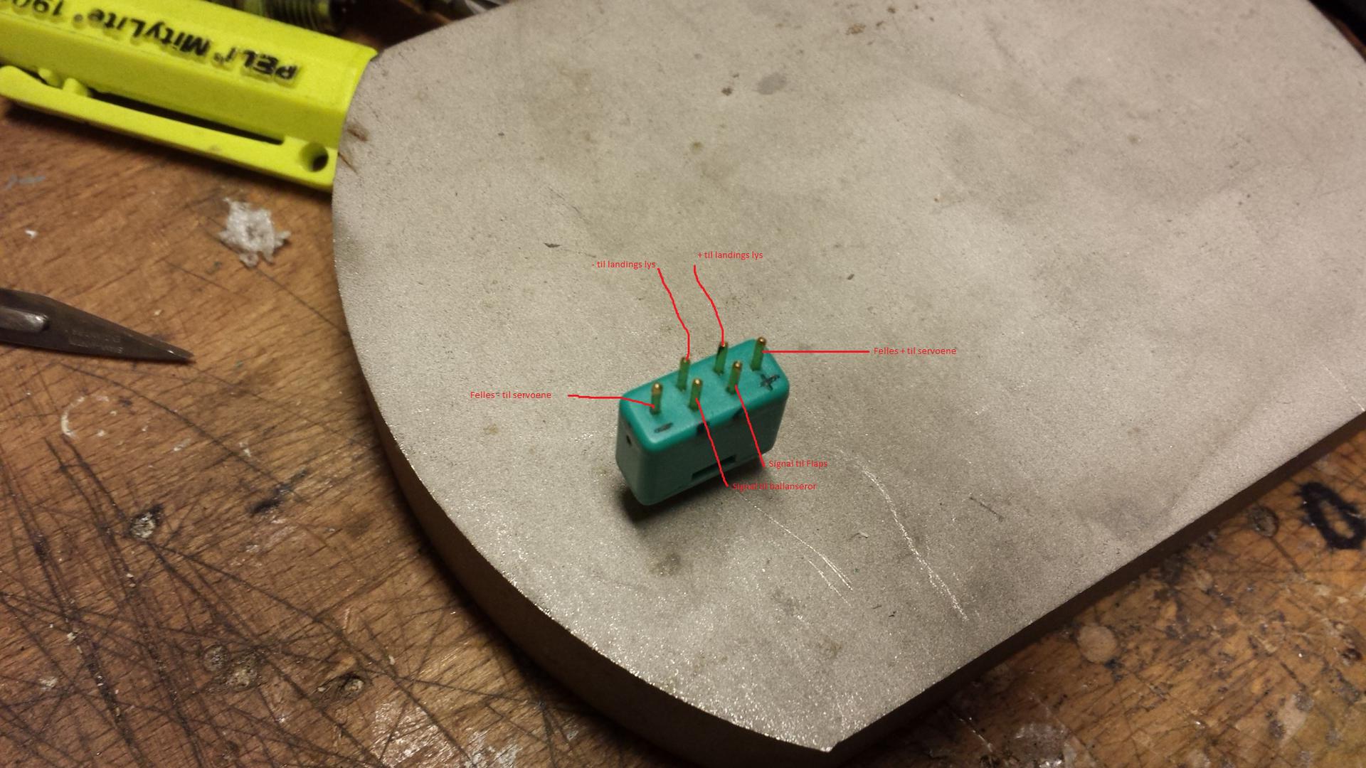 Jeg bruker MPX kontakter som jeg kjører felles + og -, men der det er bare flaps og balanse ror bruker jeg +,-,og signal på hver sin pin.