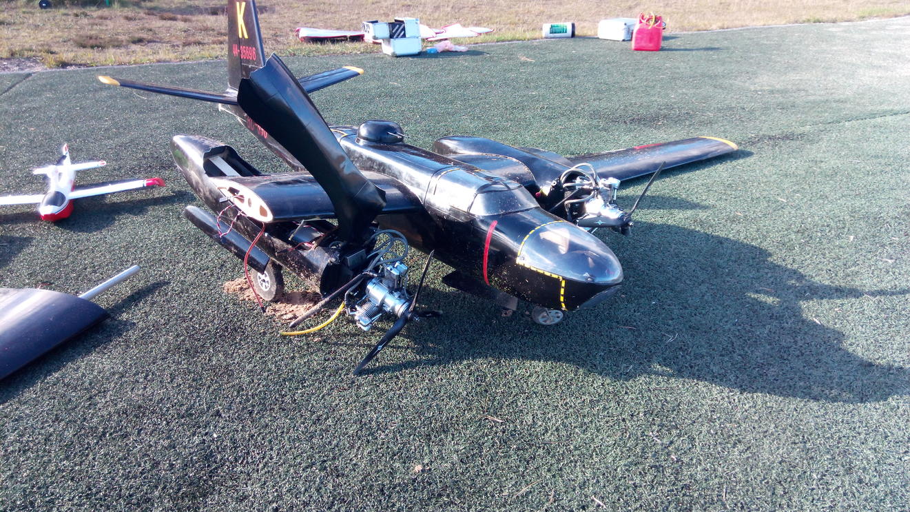 Gikk ikke så bra i dag. Motorstopp på en motor på topoen av en loop. Fikk den nesten inn på stripa men turte ikke holde den lengre for farten begynte å bli så lav så landet i sanda ved siden av stripa. Ble ikke så ille. Bøyd neselegg, ett understellsfeste også sprakk plasten på den ene poden. Fint reparerbart.