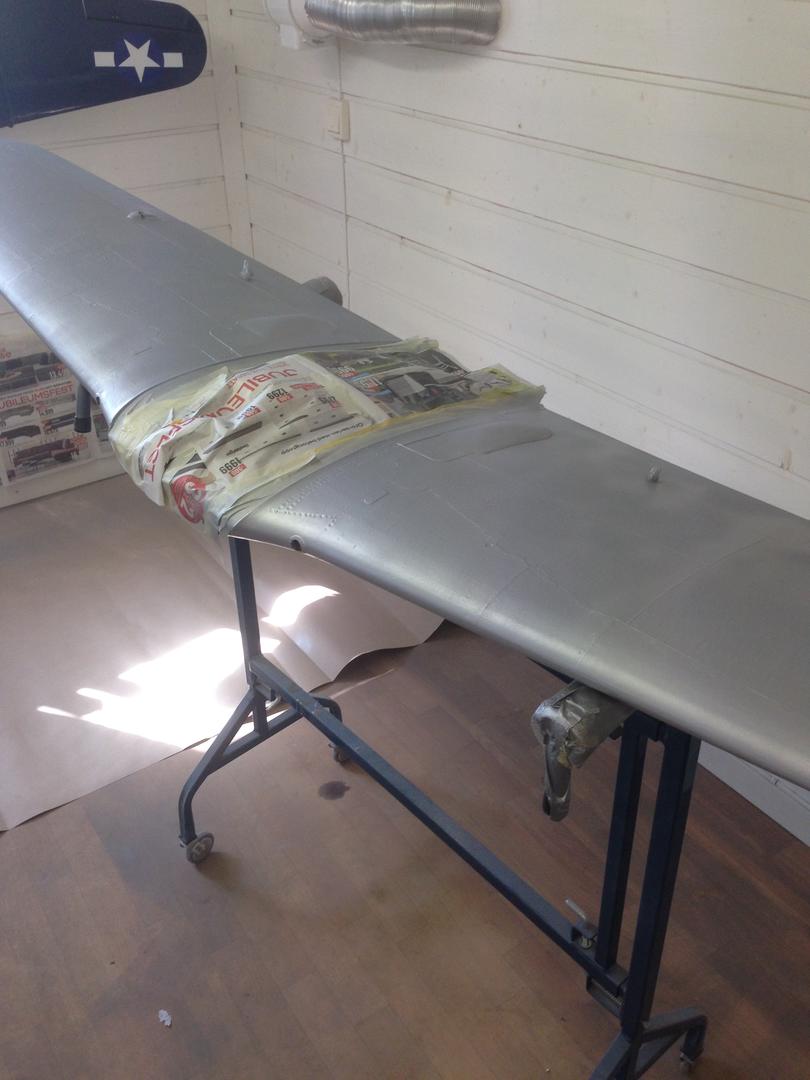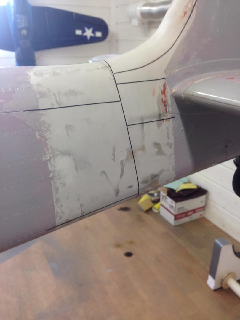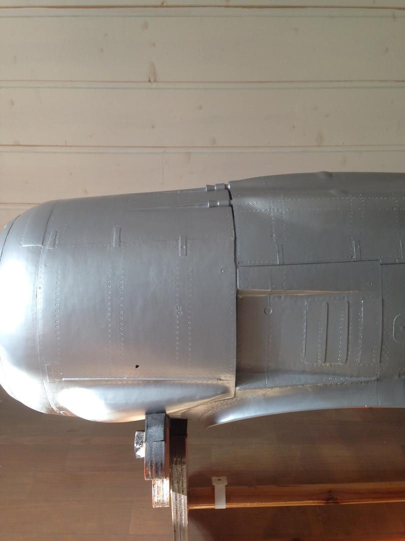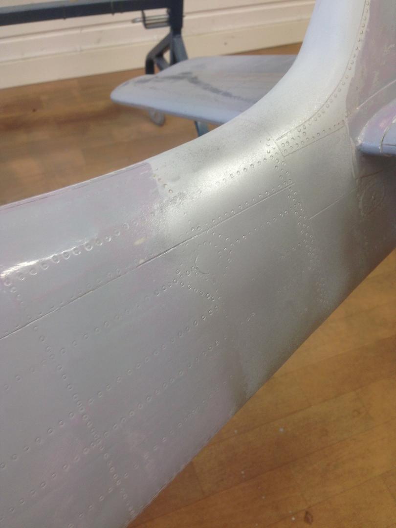 Er nå ferdig med det ødelagte område ved halen. Har også rubbet ned overflaten, vasket med aceton og brukt sparkel på sømmer i kroppen og vinger, og på de få små områdene der gelcoaten har løsnet. Så et tynt strøk med alufarge rett fra sprayboks.
