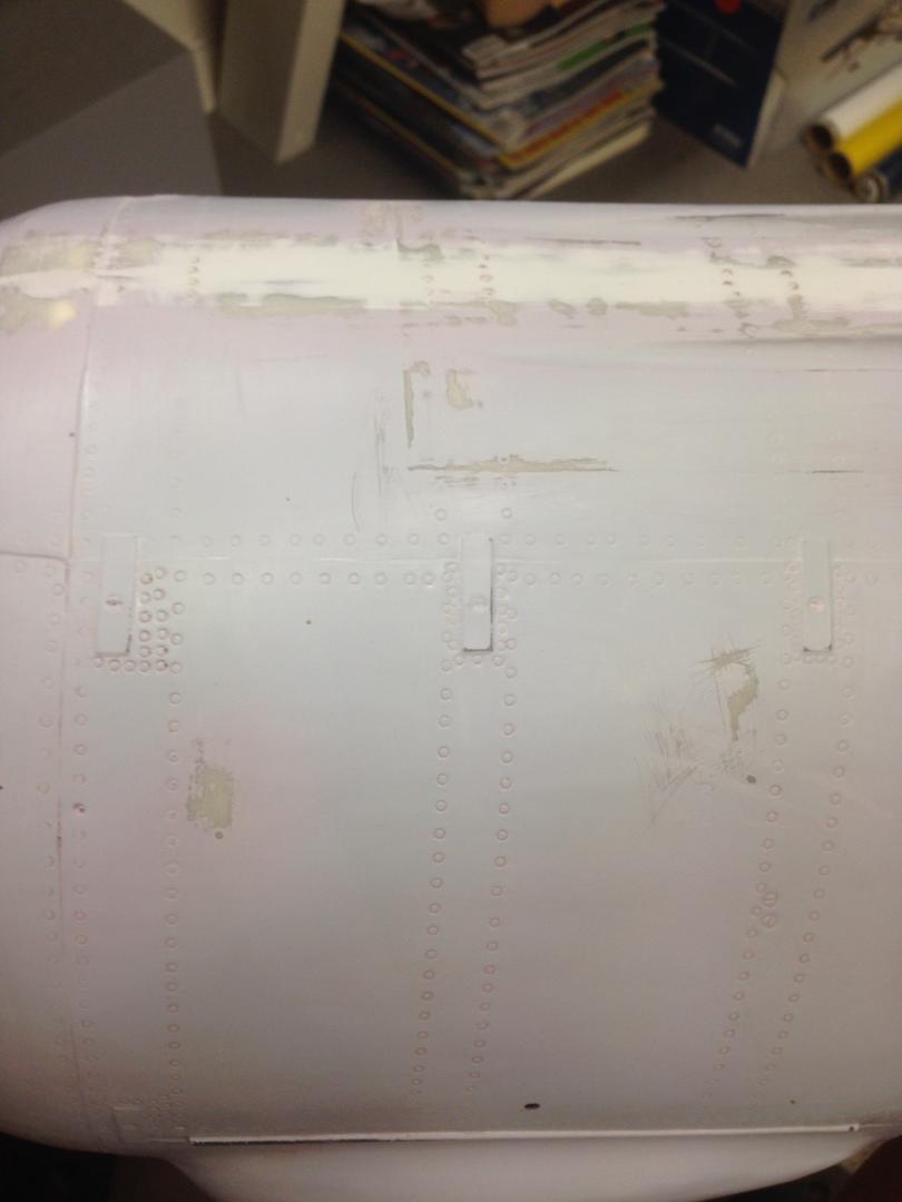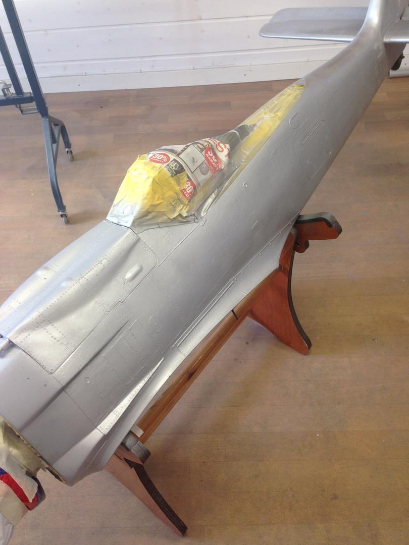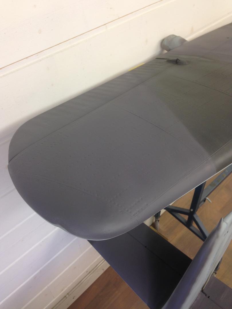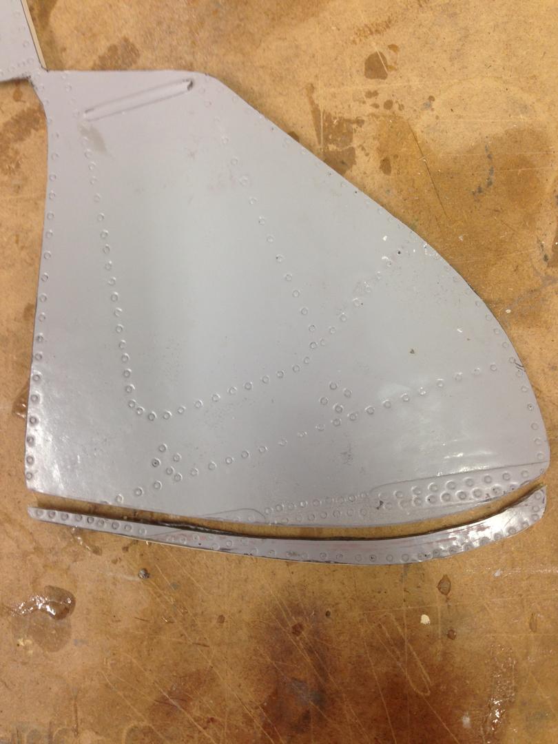 Er nå ferdig med det ødelagte område ved halen. Har også rubbet ned overflaten, vasket med aceton og brukt sparkel på sømmer i kroppen og vinger, og på de få små områdene der gelcoaten har løsnet. Så et tynt strøk med alufarge rett fra sprayboks.