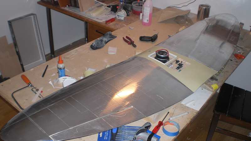 Og satte alt sammen. Hun veier nå 10,4kg med bly som batterier og pilot. Tyngdepunktet ligger ca 12mm for langt fremme. Ser bra ut..