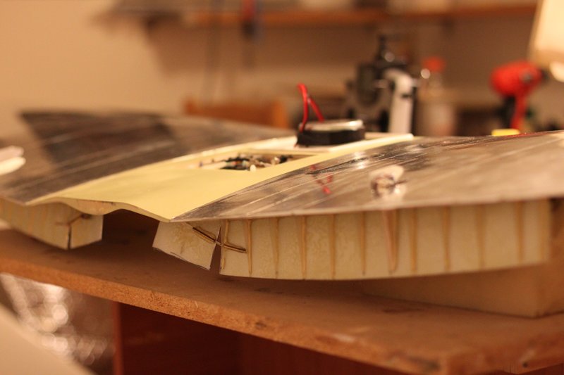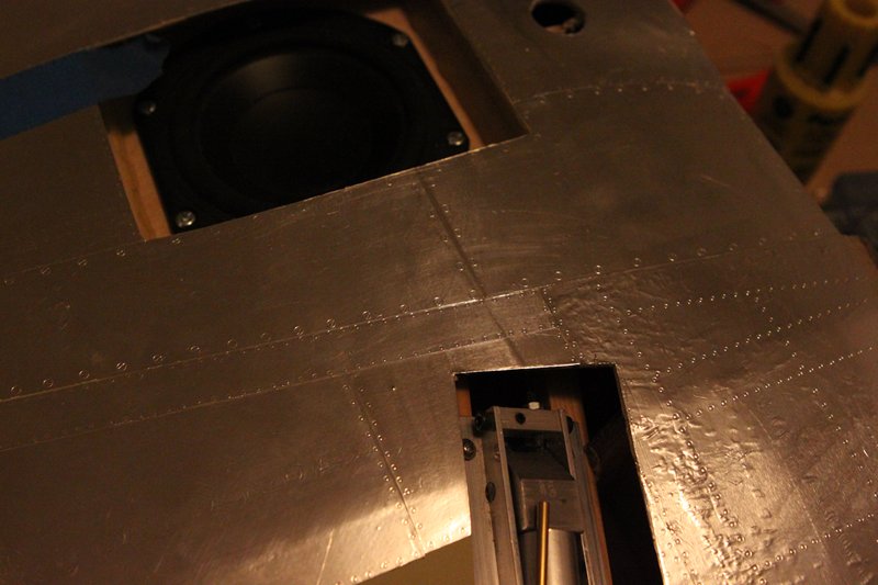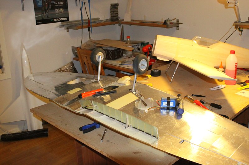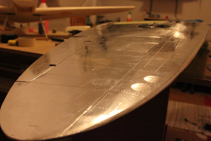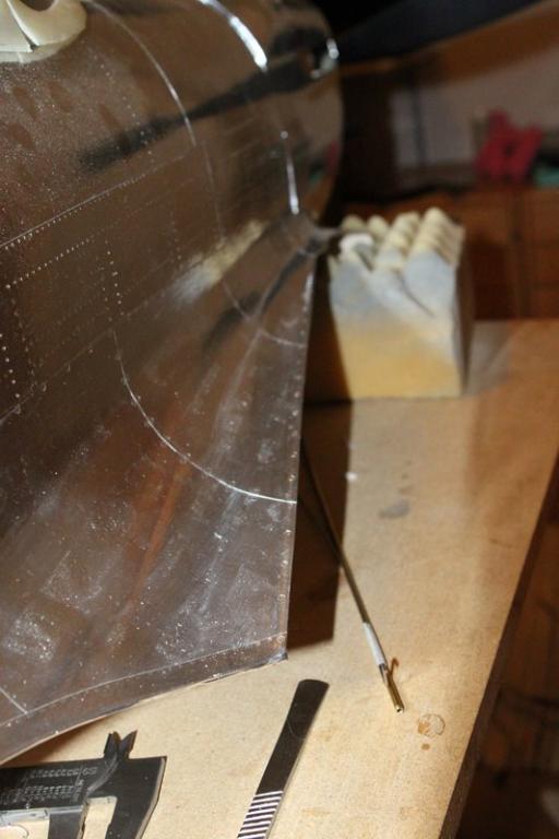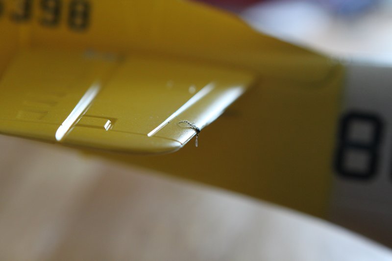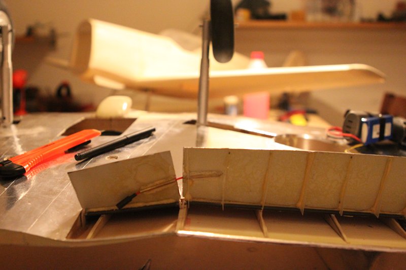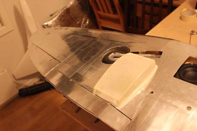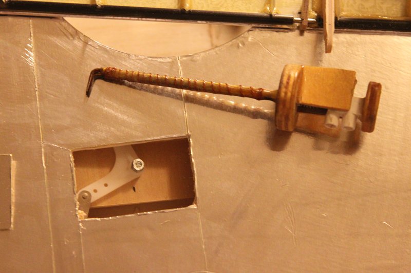 Og ja nå er det beveglse i spitfire òg! Måtte til med en liten operasjon når det viste seg at når jeg ga høyderor og ga roret litt motstand bøyde bar staget seg inne i kroppen Såg litt mørkt på det siden staget er godt begravd.. Men fikk det ut og tredd en pianotråd inn i det og med hjemmelagd tannlegeverktøy og LEDlys til nattesykkel fikk jeg det på plass igjen. Når er roret fast, stramt og presist!