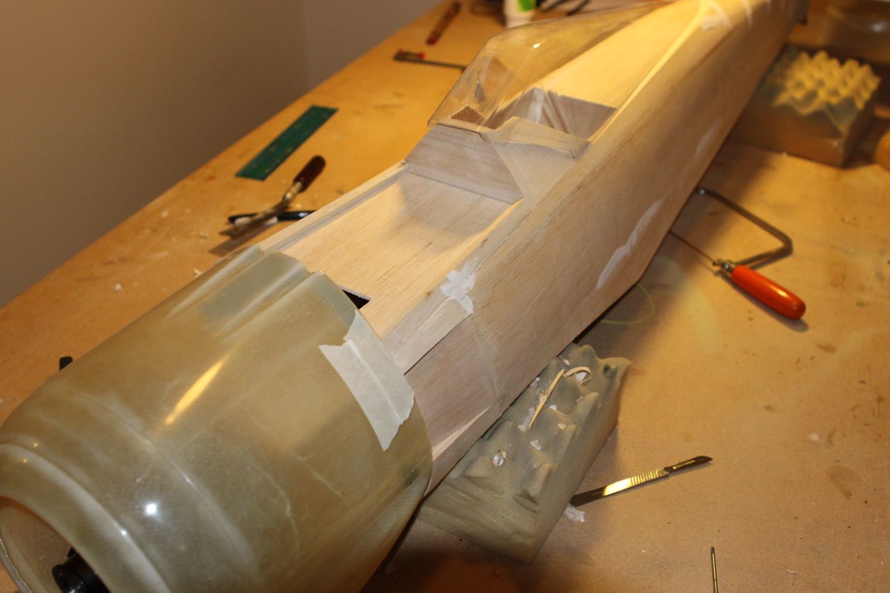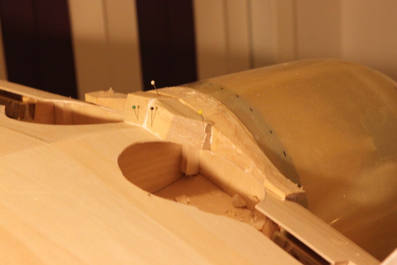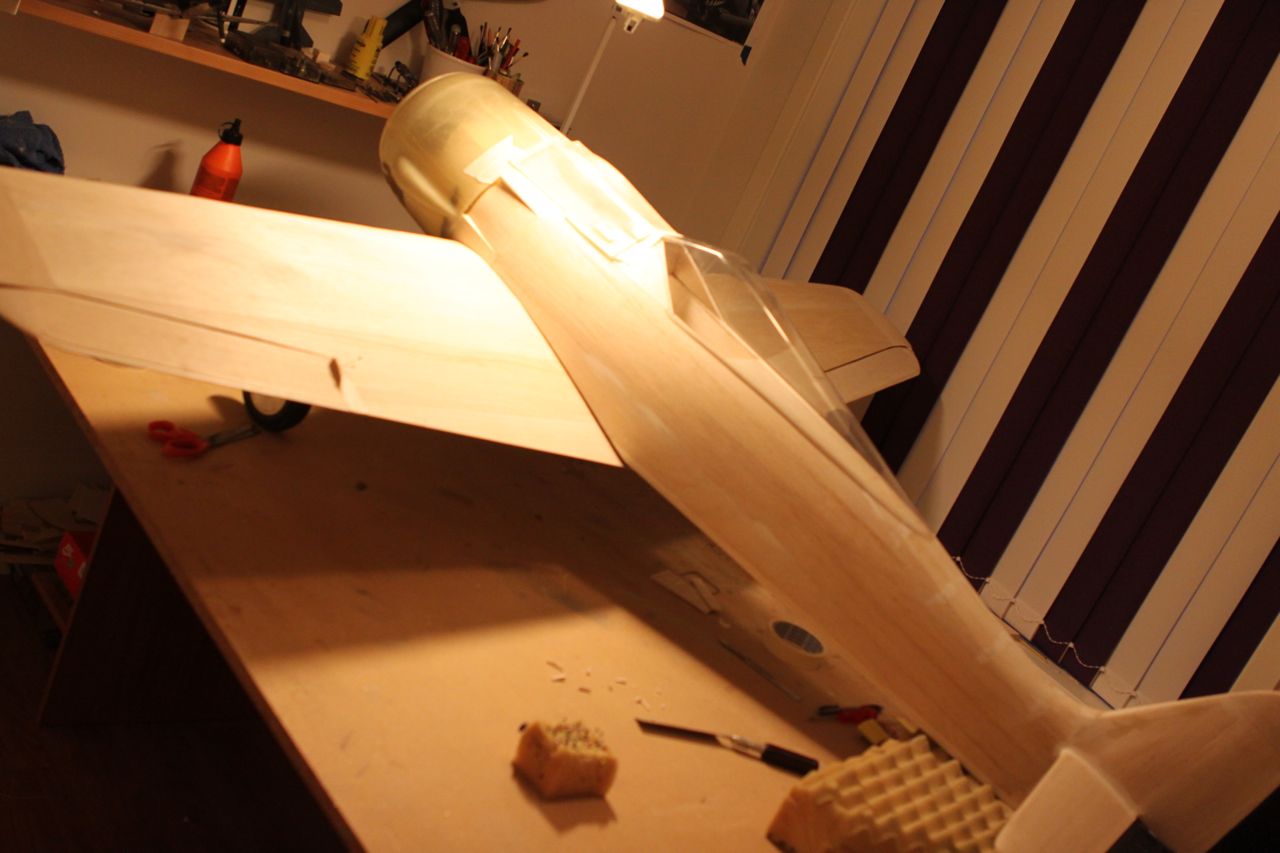 Jobber litt med cowling, viser seg at propell er 5mm utav senter, altfor mye. Cowl ser rett ut så det ser ut som om jeg må flytte motoren.. Har også lagt på en balsplate foran cockpit og lister langs sidene for å begynne med våpendekselet.