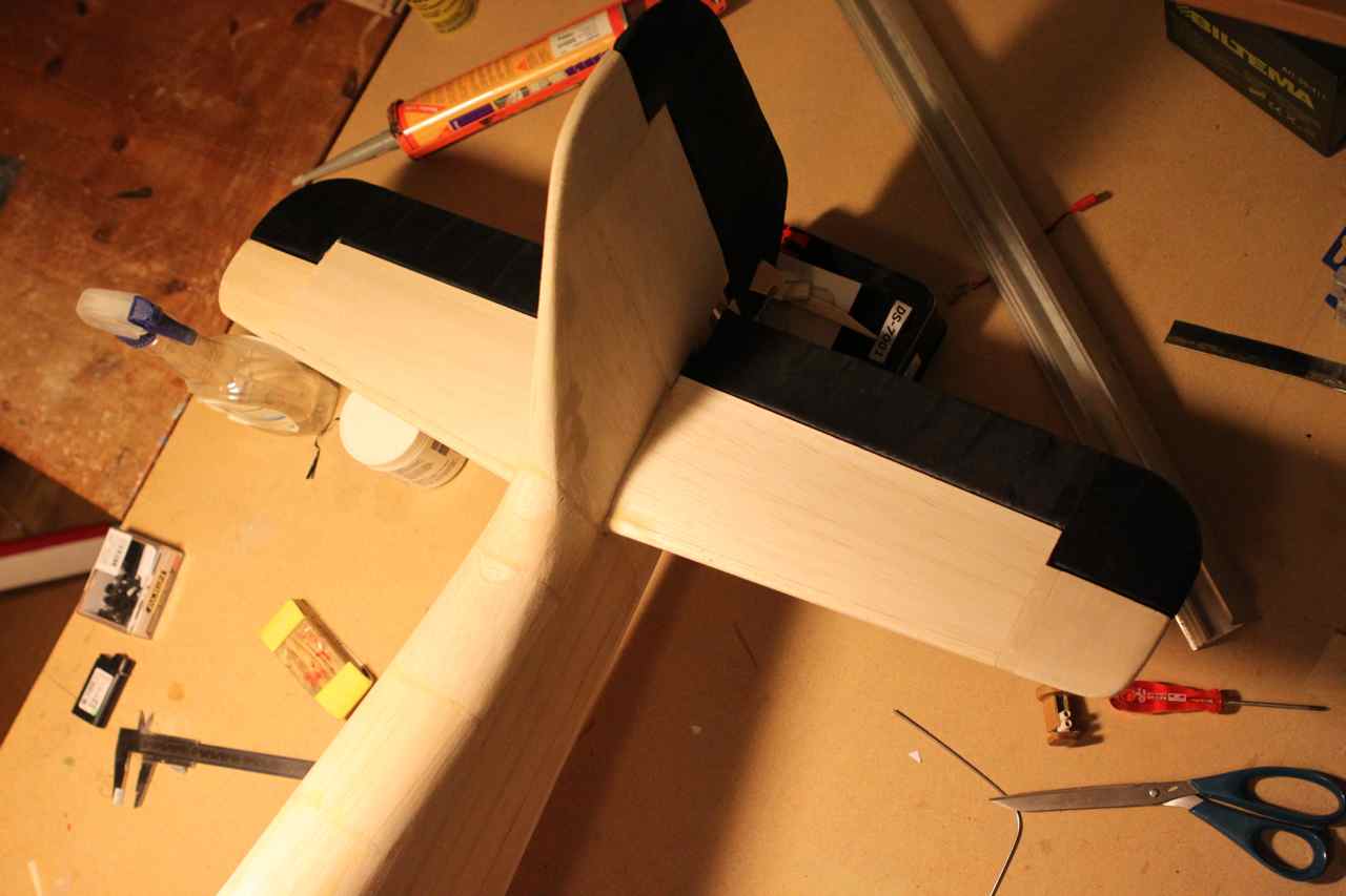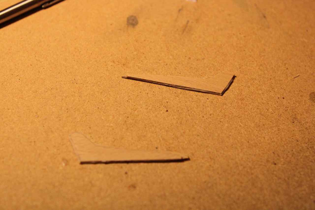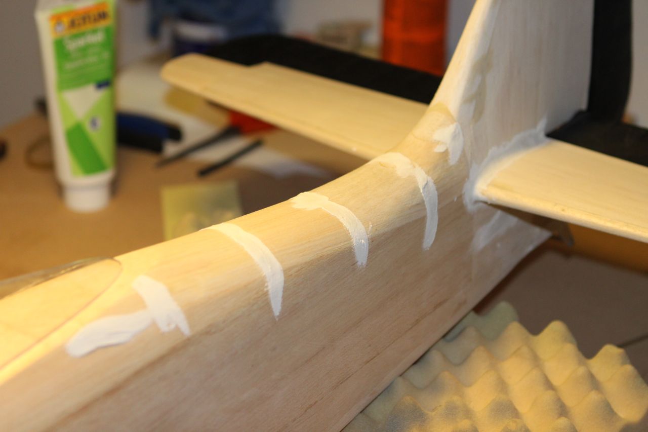 Holder på med flapsen, har laget kontrollhorn av 1mm kryssfiner limt sammen til 2. De er pusset og formet bedre enn på bildet. hullene er også fyllt med lim for å mette og binde veden, så borrer jeg litt når limet tørker.
