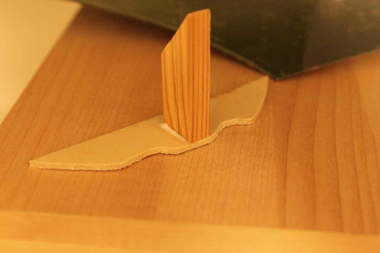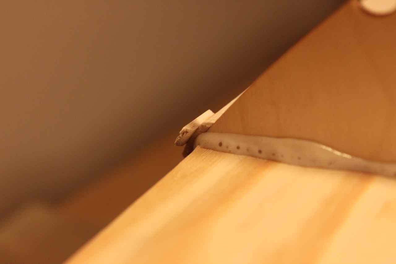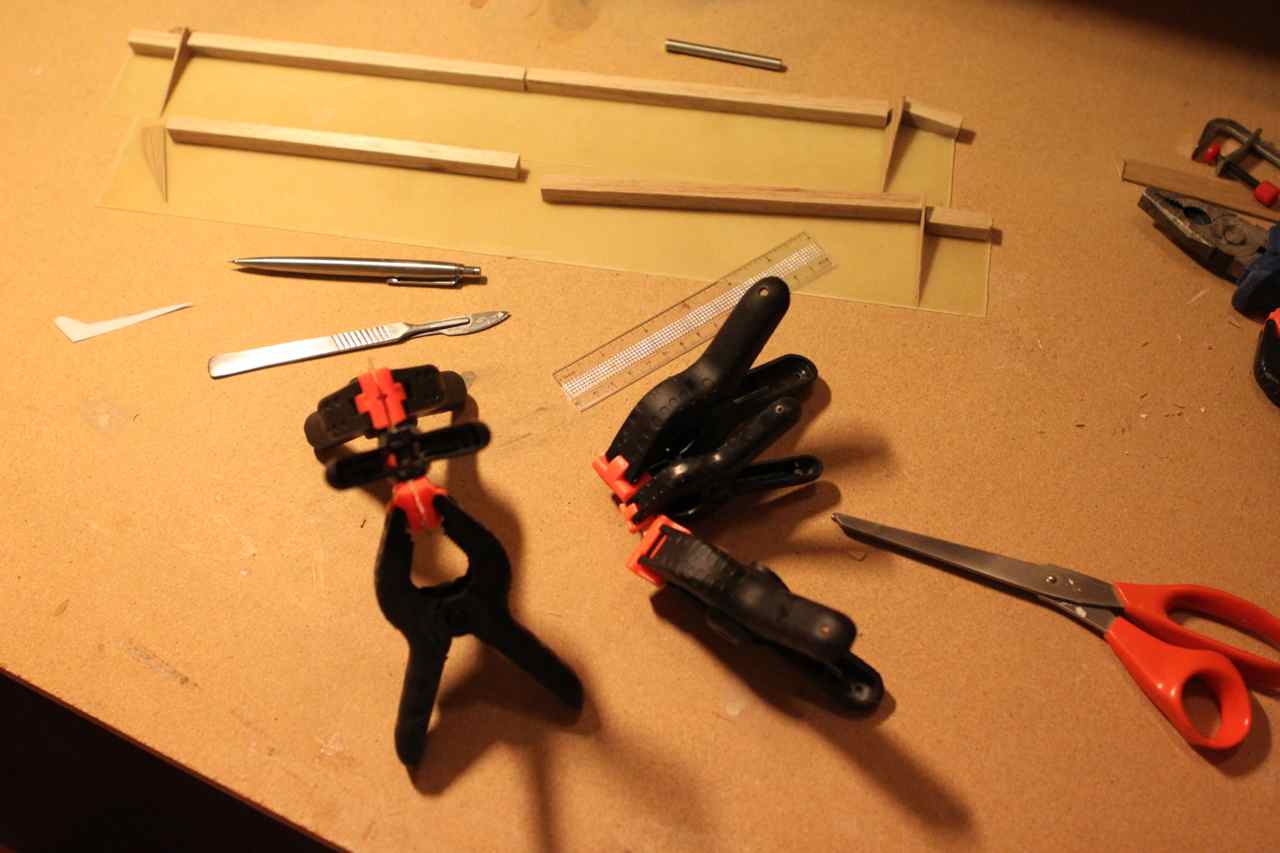 Holder på med flapsen, har laget kontrollhorn av 1mm kryssfiner limt sammen til 2. De er pusset og formet bedre enn på bildet. hullene er også fyllt med lim for å mette og binde veden, så borrer jeg litt når limet tørker.