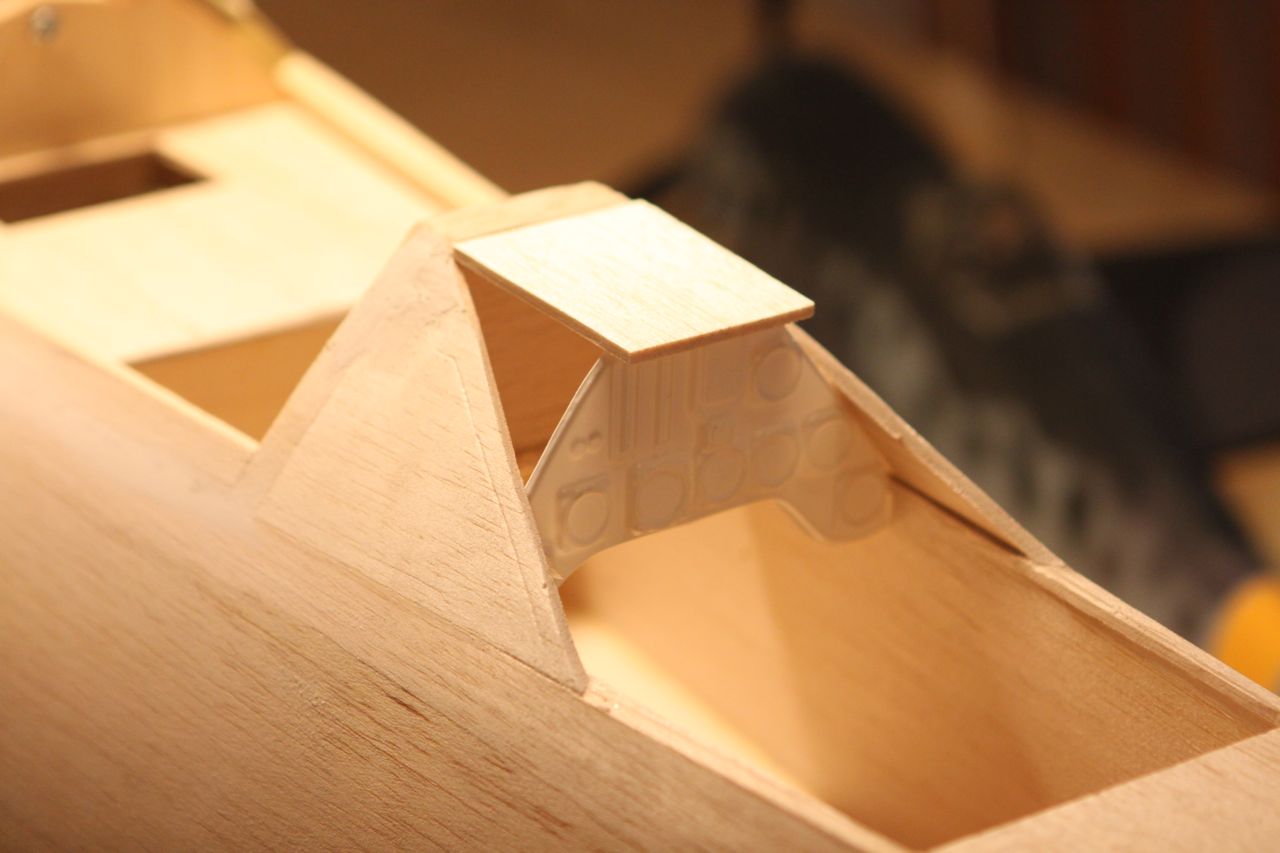 Stresser videre med cowl ( finnes det et godt norsk ord på denne? ) Skal lime inn denne lille saken, borre et lite hull i den og skru den fast til profilen foran våpenluken. Dessverre er det ikke helt eksakt lik form på kroppen til Platt og cowl til Holman så jeg limer på to små saker for å holde cowl inntil kroppen ved liming. Dette må limes med alt på plass og blir sikkert spennende.Click image for larger version