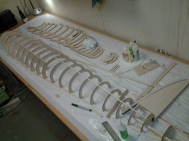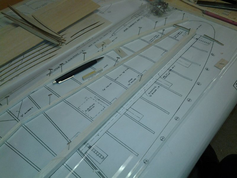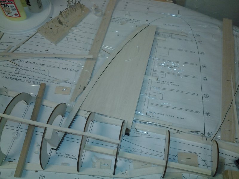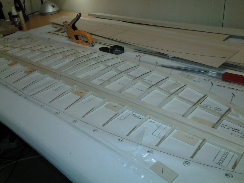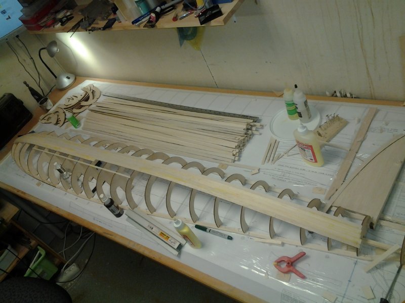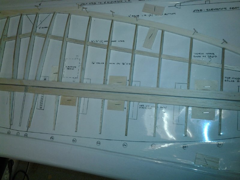 Først ut var horizontal stab, denne bygges i to halvdeler. Som alltid har jeg en furuplate å bygge på. Tegningen spennes opp og dekkes med Glad Pack og så er det bare å begynne