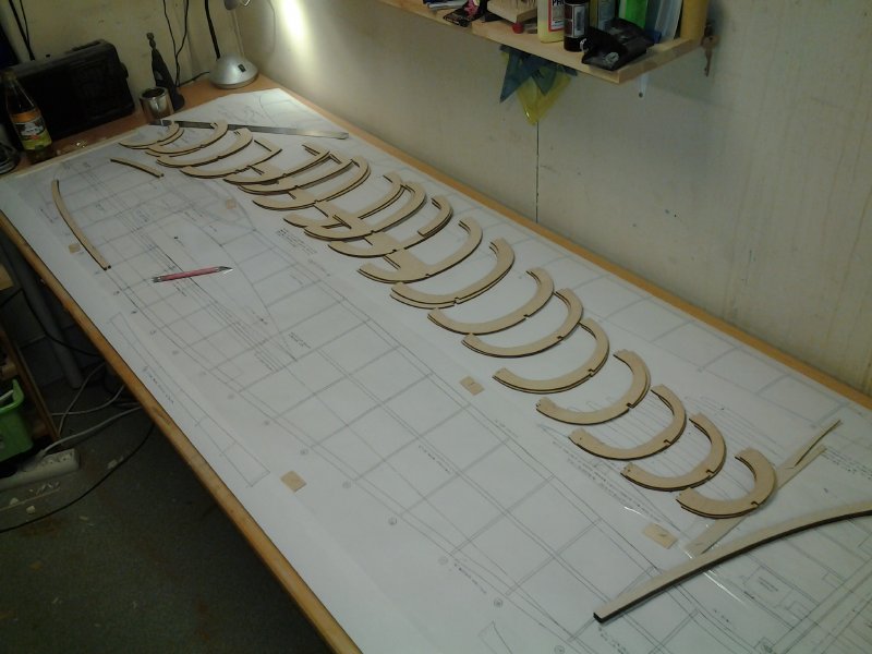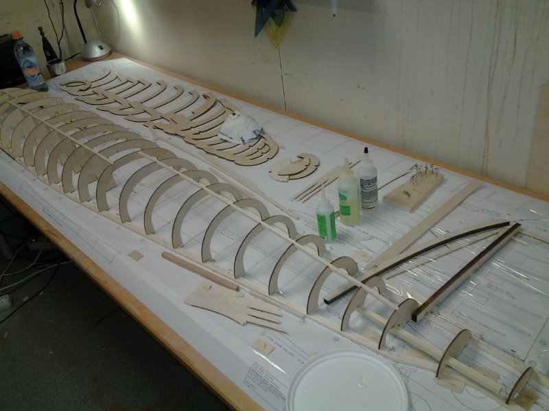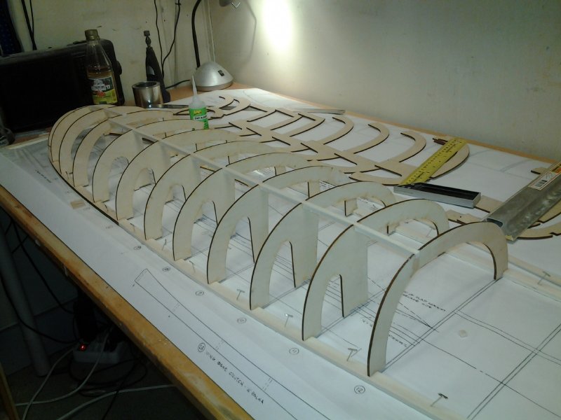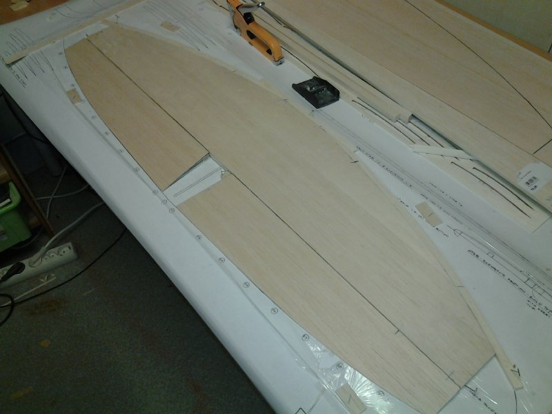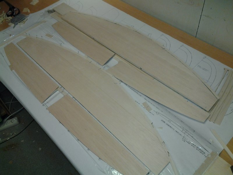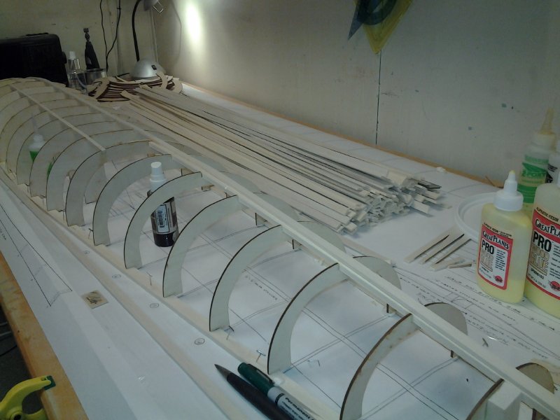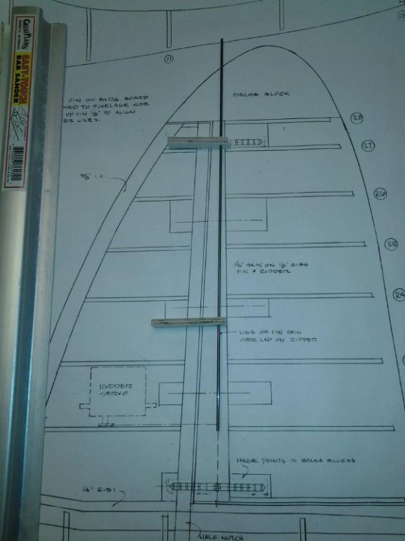 Først ut var horizontal stab, denne bygges i to halvdeler. Som alltid har jeg en furuplate å bygge på. Tegningen spennes opp og dekkes med Glad Pack og så er det bare å begynne