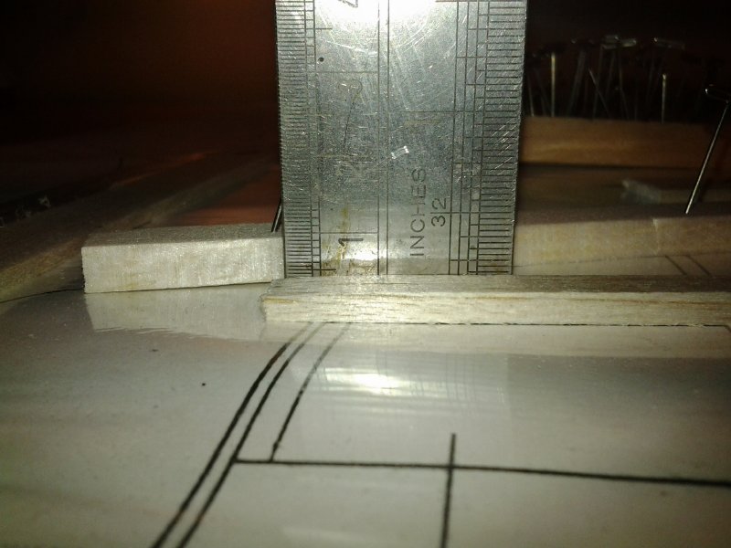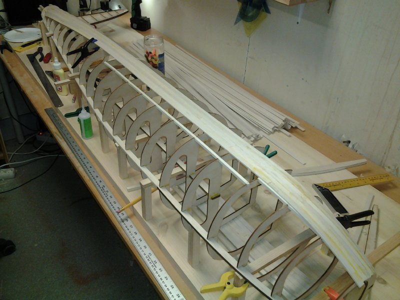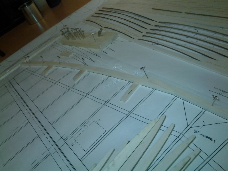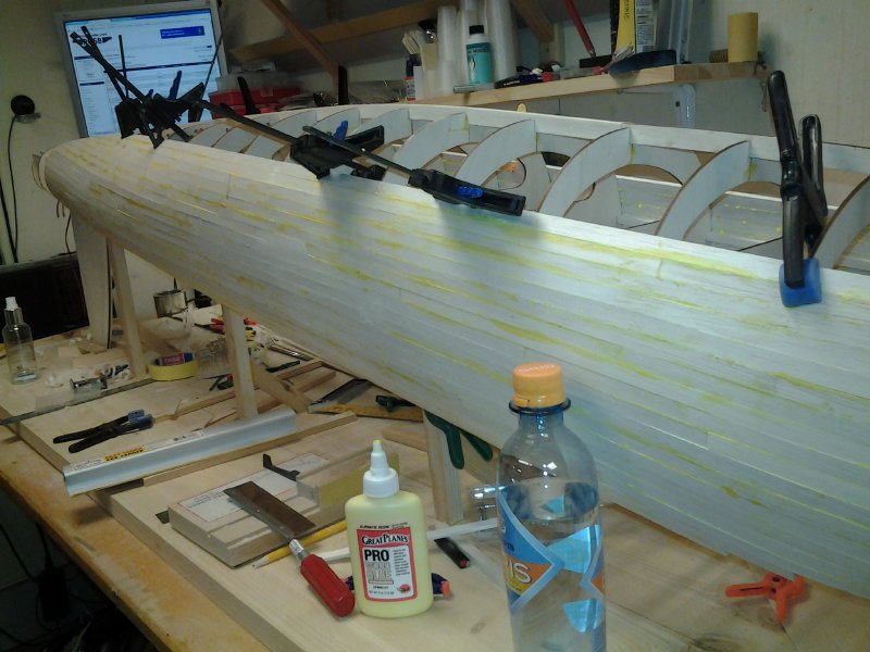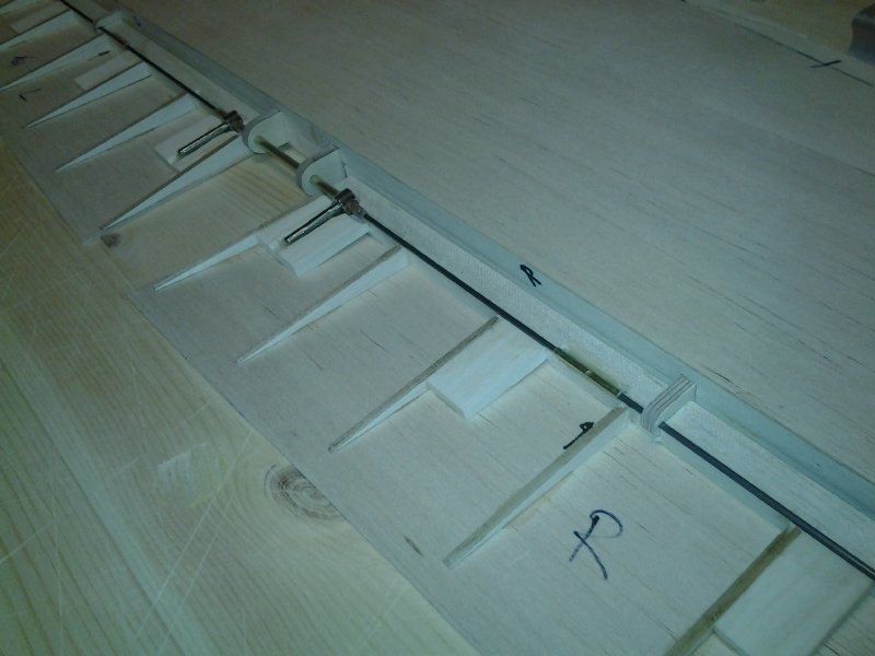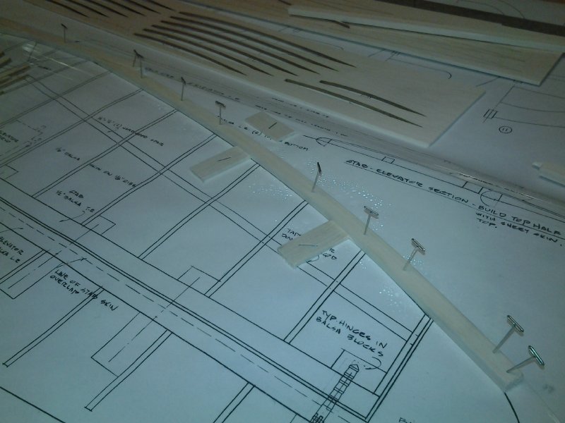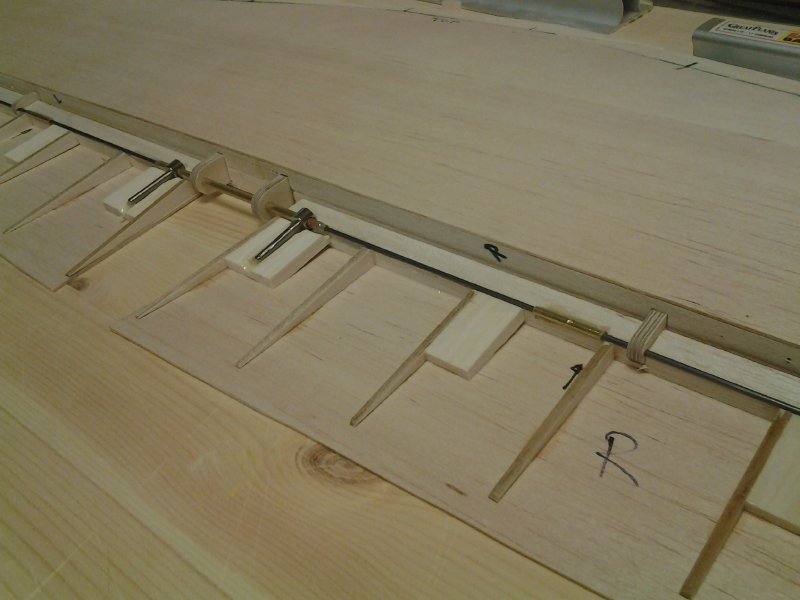 Første var leading edge, denne er buet fra root til tip og jeg laget en list av 1/4" soft balsa. Så var det å spenne denne opp på tegningen og gi den en runde med 50/50 sprit og vann og la det hele tørke.