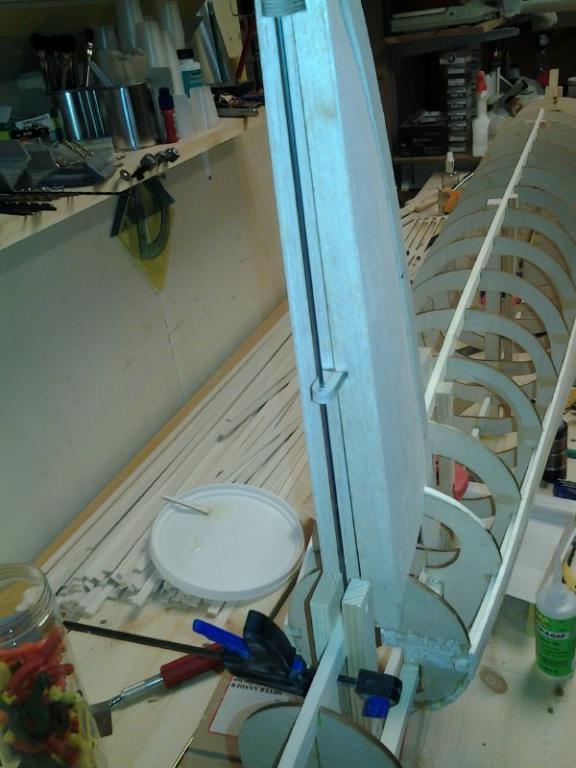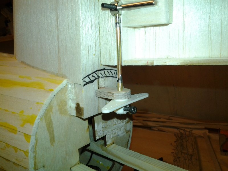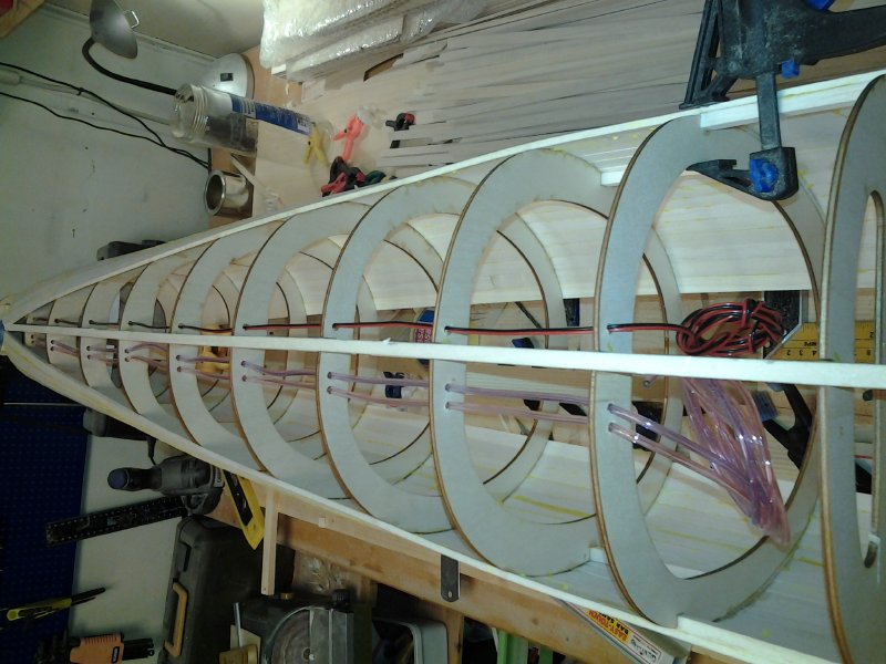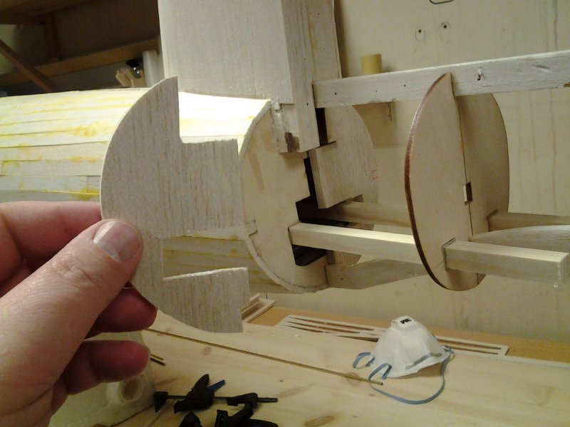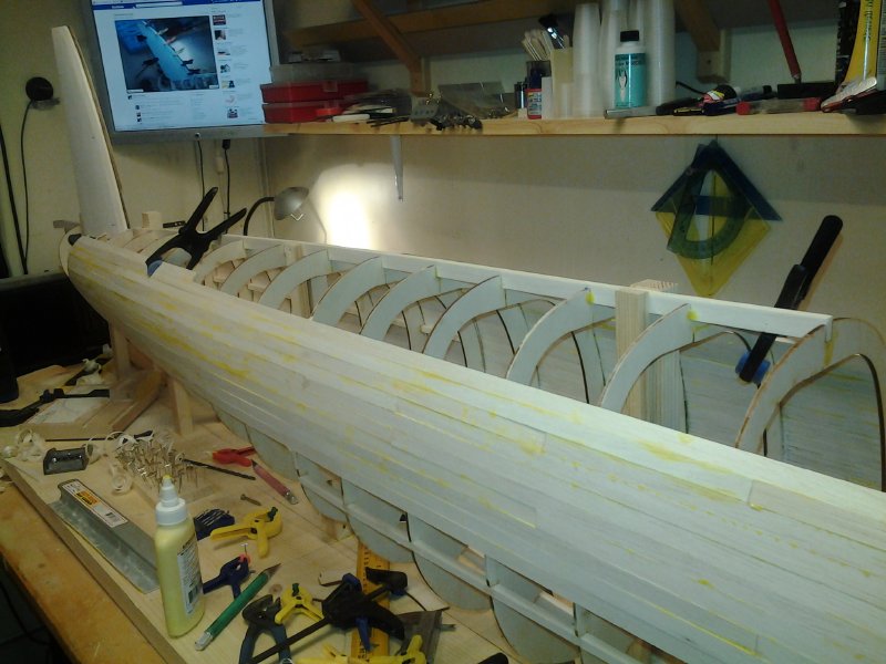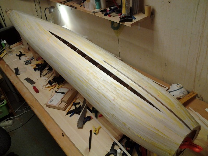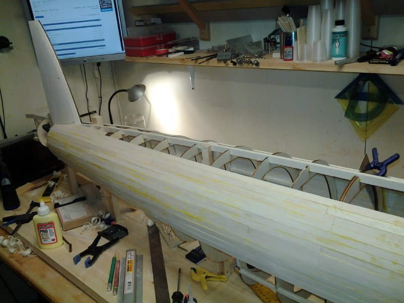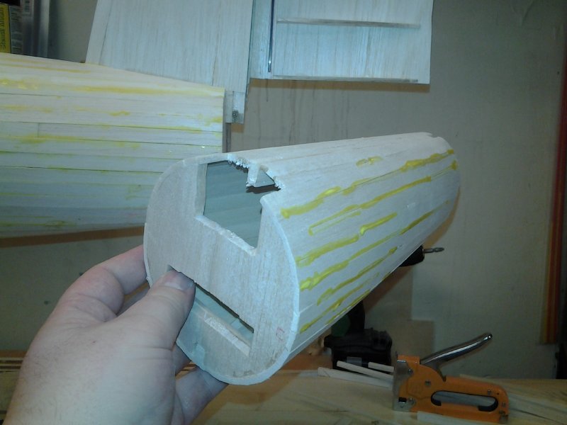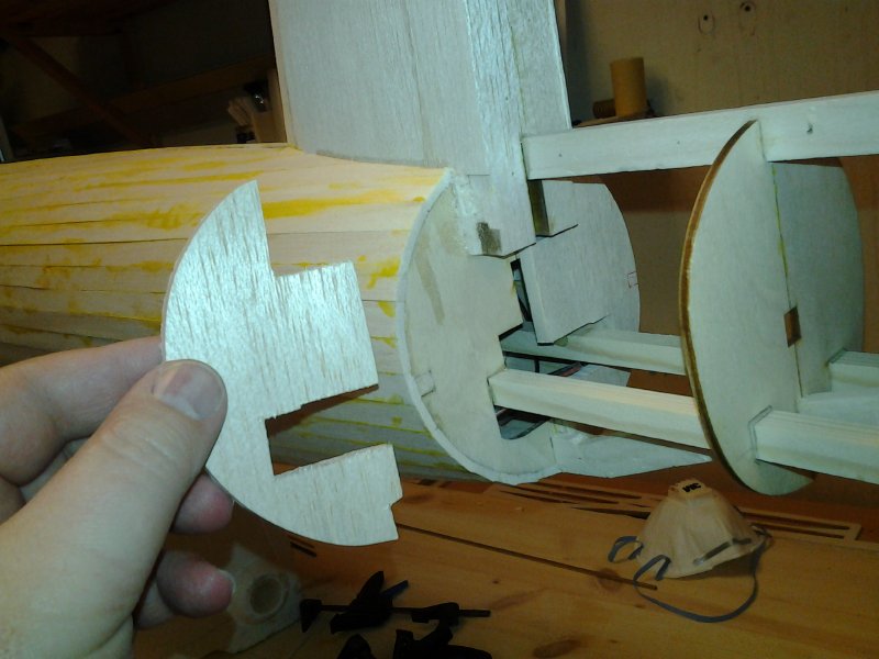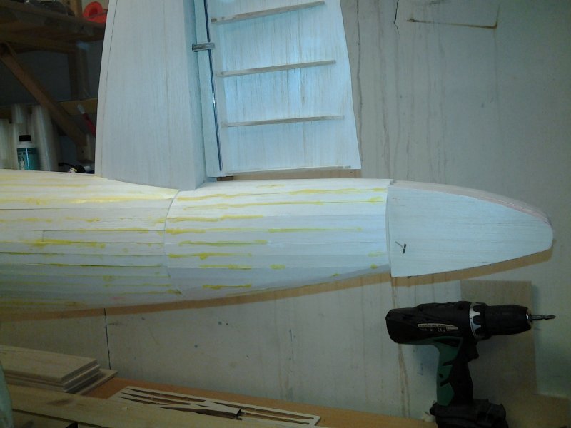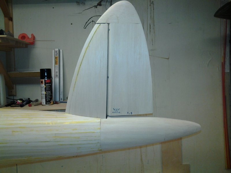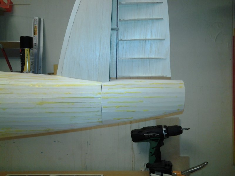 Neste var halekonen, hadde noen vyer om å lage en plugg i blåskum og så støpe en i glassfiber... Men jeg er nok mere venner med balsa så da ble det å lage en i balsa! Lagde først et spant i 6mm hard balsa som jeg festet inntil spantet under finnen (ikke limt til dette spantet). Så lagde jeg et spant i 3/8" og festet helt bakerst, limt kun i senter til det bakerste ply spantet. Så ble det strip planket og kun limt til 6mm og 3/8" spantet. All den andre strukturen skal ut når konen er ferdig slik at det bare blir et balsarør egentlig.