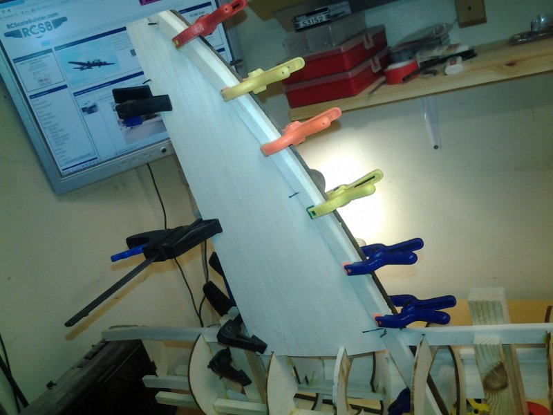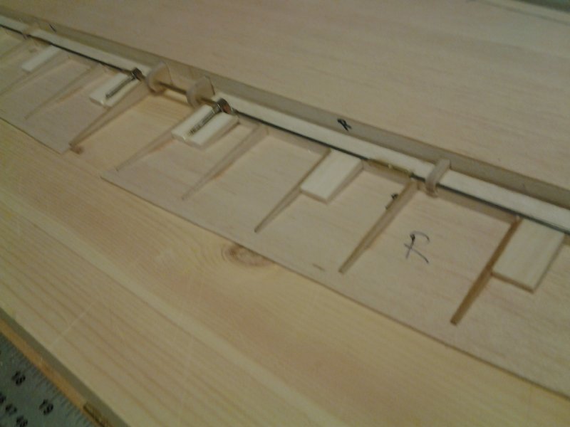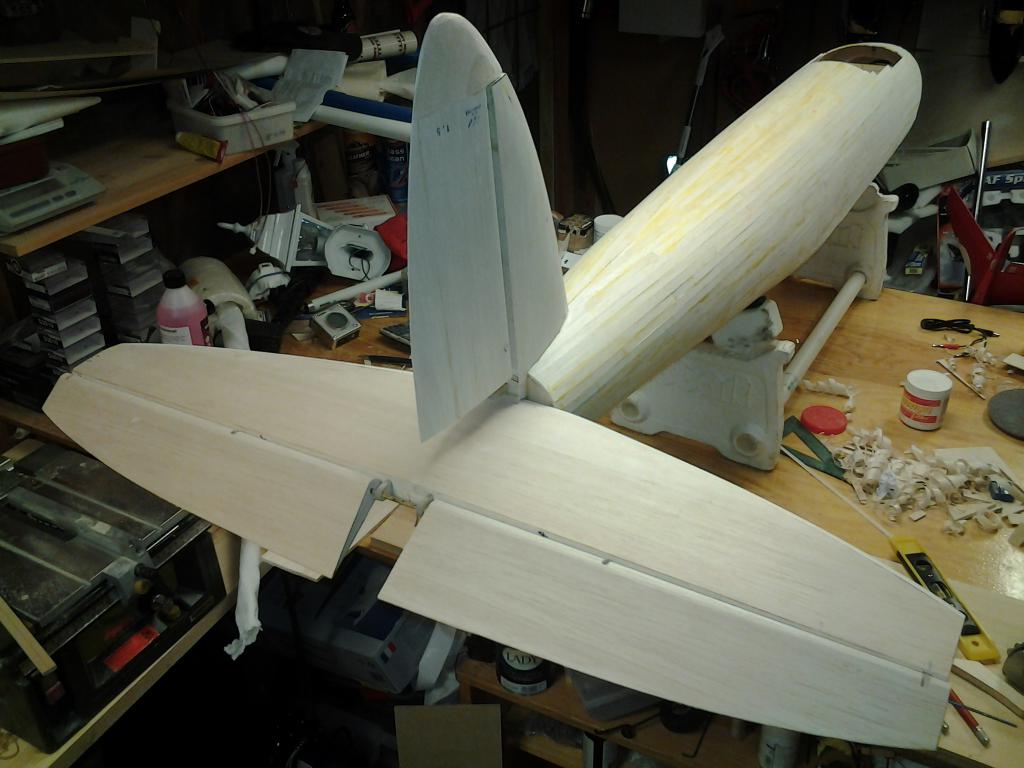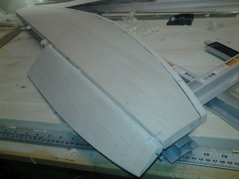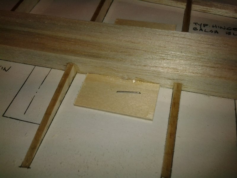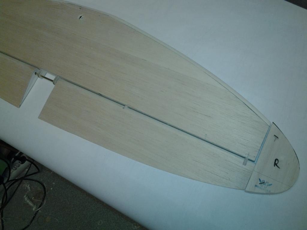 For å holde allt på plass mens jeg pusset før huden skulle på så stiftet jeg fast balsabiter inntill LE og TE og limte fast med zap og kicker slik at det ble en sprø limfuge som er lett å knekke av etterpå.