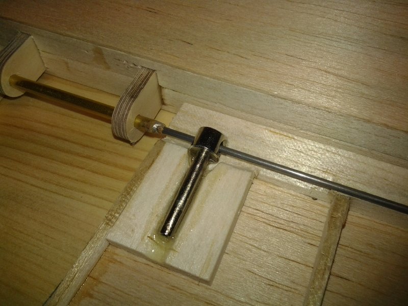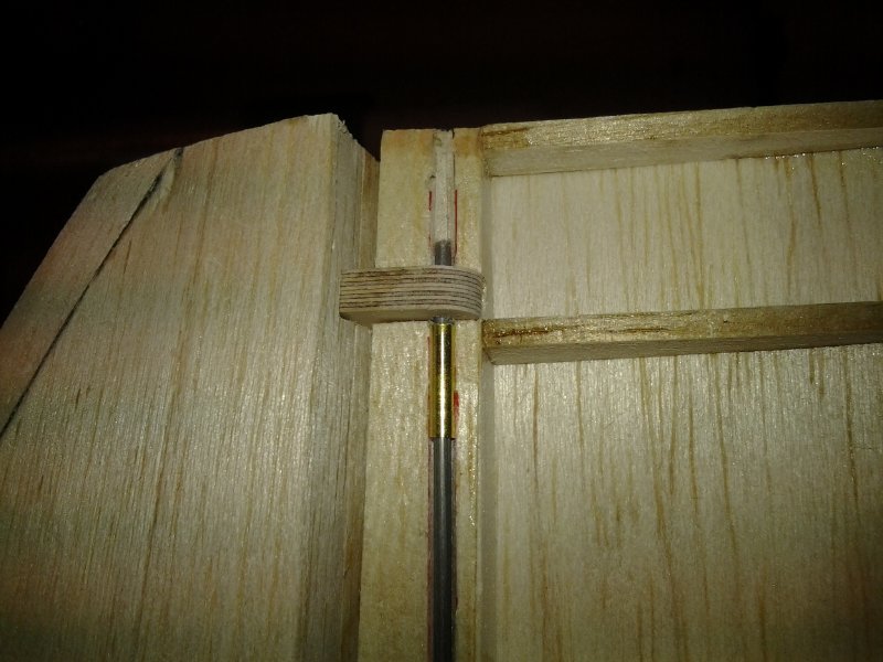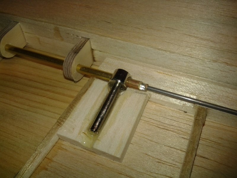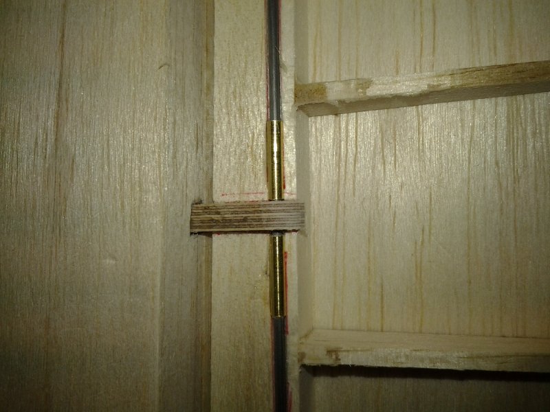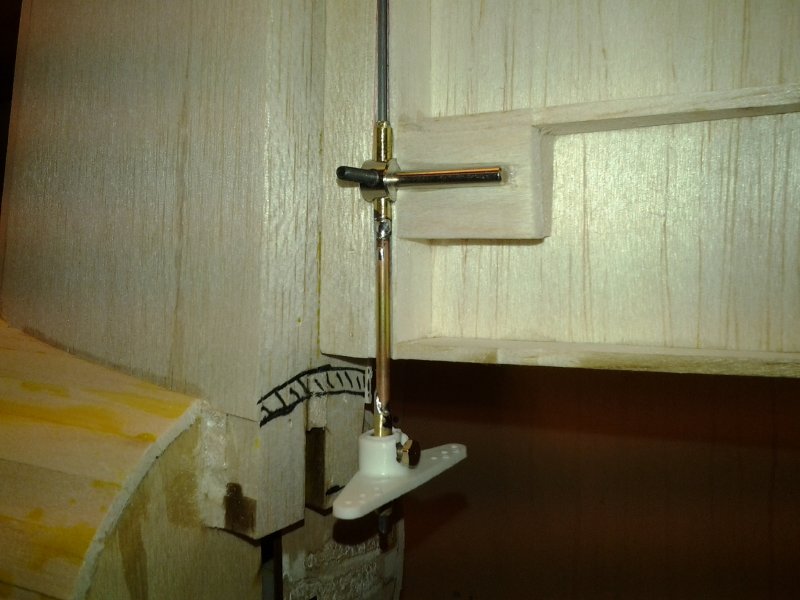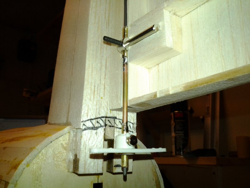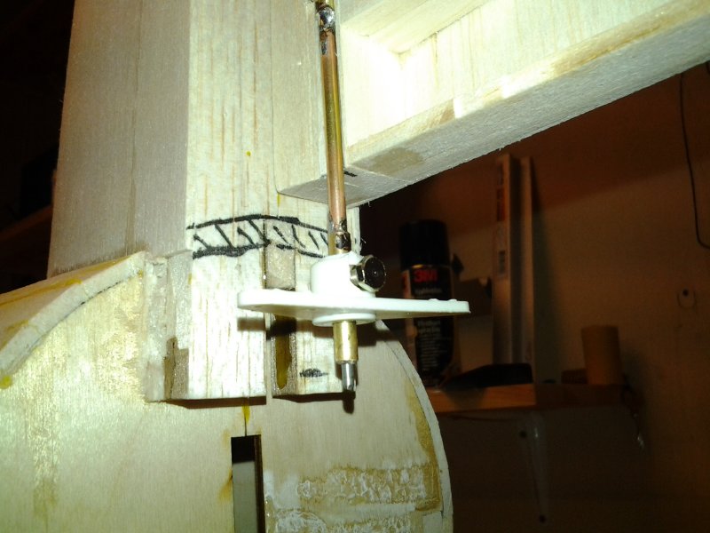 Løsningen ble slik. For å kunne fjerne hengsletråden så må den ned, der sitter også overføringen til pull pull wirene og det kompliserer litt. Lagde et rør av messing som består an en 3mm del og to 4mm deler og loddet disse sammen. Så fant jeg en gammel hjulaksel som jeg da limer fast inne i roret, denne vil da overføre vridningen til roret når 4mm delen av røret settes fast med en settskrue som kan nås via et hull i roret. Røret vil også fungere som den nedre hengslen til roret. Dette var den enkleste løsningen jeg kunne komme opp med for å få det skala og helt skjult.