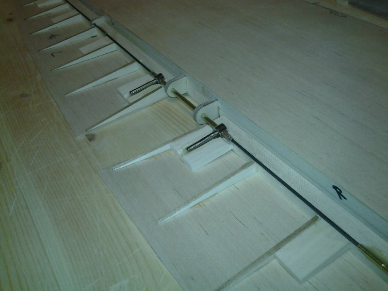 Stab, også her var det tegnet servoer og Robart hengsler. Jeg har da valgt en annen løsning med pull pull og skalahengsling. Bak på dette flyet viser tegningen ikke midre enn fem servoer og kan man spare vekt bak så er jo det å foretrekke. Laget hengsler på samme måte som på sideroret med ply og 2mm tråd. Ogsåp her har jeg et ønske om å hating avtagbart og løsningen ble lik den på sideroret. Laget blokkene og fikk plassert dem korrekt før stab halvdelene blelimt sammen