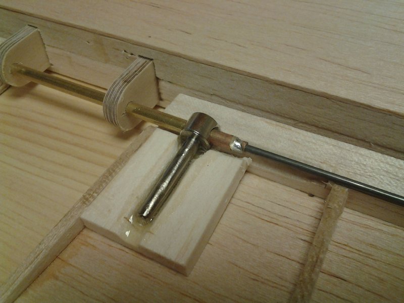Brukte igjen hjulaksler som ble limt inn i rorene og en bit med messingrør imellom rorflatene. 4mm rør med et 3mm rør loddet fast inni og selve hengslen på 2mm som tres igjennom hele greia, rorhornet settes fast på messingrøret. Røret må flyttes til siden før ror kan tas av