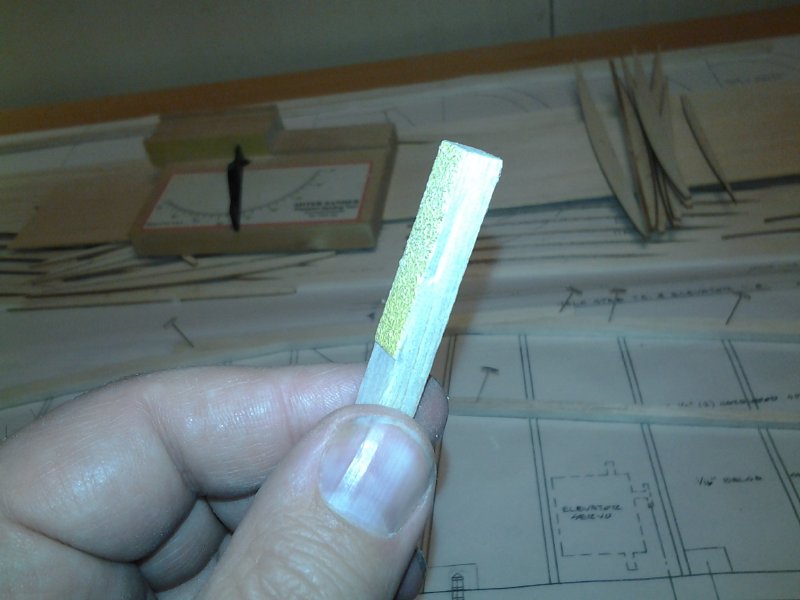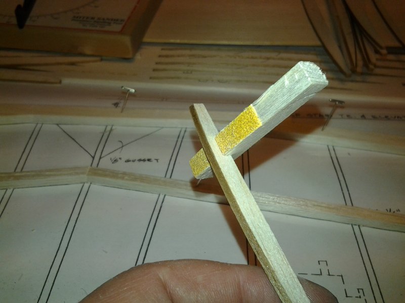 Så var det spantene, disse måtte tilpasses over tegningen. Laget meg et lite verktøy for å lage disse utsparingene i spantene som skulle over bjelken av en bit balsa som var til overs etter bjelken. Limte på litt sandpapir og så får man perfekt passform.
