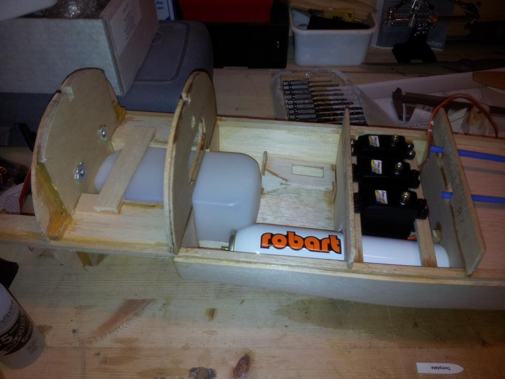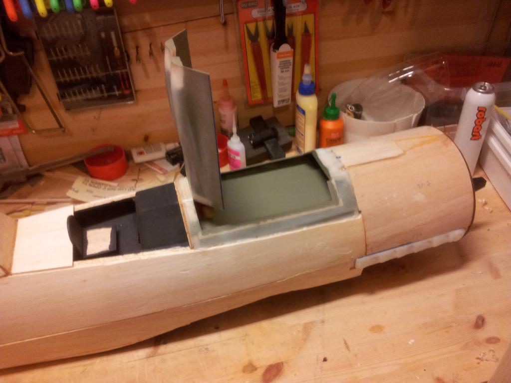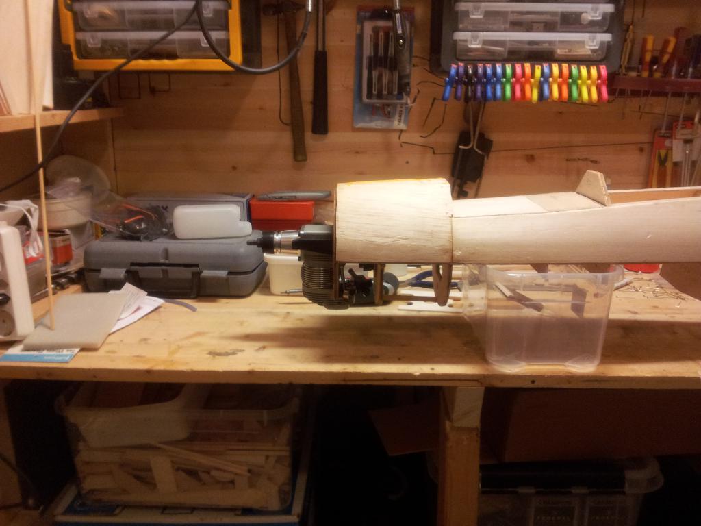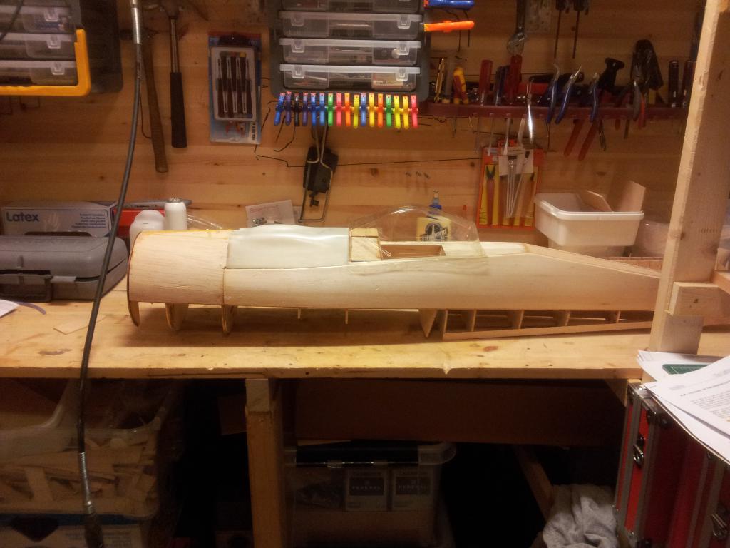 Jeg har nå startet opp igjen byggeprosjektet som ble på begynt forrige vinter, Det har blitt litt prøving og feiling underveis, og en del ombygging fra de orginale tegningene bla. for å tilpasse firewall for motor (som blir en Laser 120). Anbefalt for dette settet er 60 totakt eller 90 firtakt, men en 90 4takt vil stikke lengre ut fra cowlingen enn det denne laser`n gjør, så derfor ble denne valgt. Det er flere i utlandet som har bygd dette flyet med bensin motorer med samme vekt som laser`n så jeg har trua på at dette skal gå bra. Jeg har også hatt en del ombygging i vingene i forbindelse med retractene som jeg kjøpte fra Robart. Retractene er 75` luft/luft hvor akslingene står 90` på leggen, så jeg måtte bøye akslingene og file litt på leggen for å få en noenlunde riktig to in. Jeg ble sterkt frarådet(av kwik) til å kjøpe century jet sine som er tiltenkt dette byggesettet.
