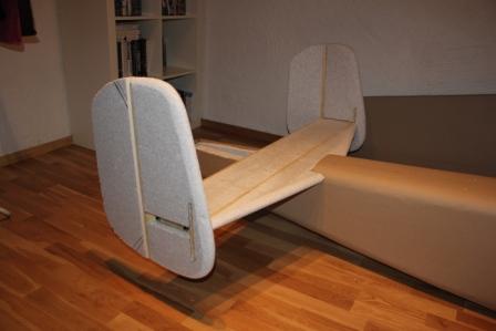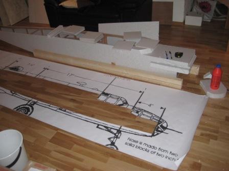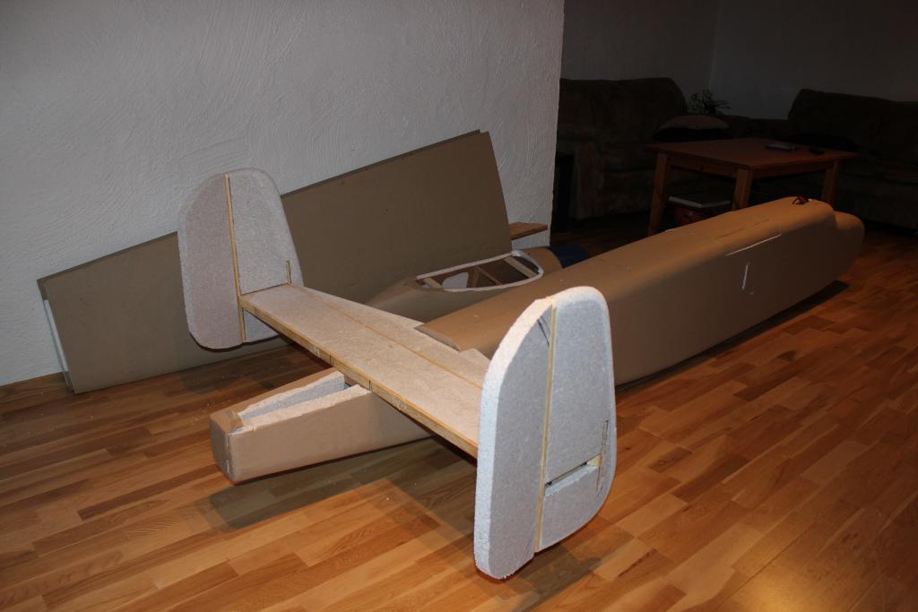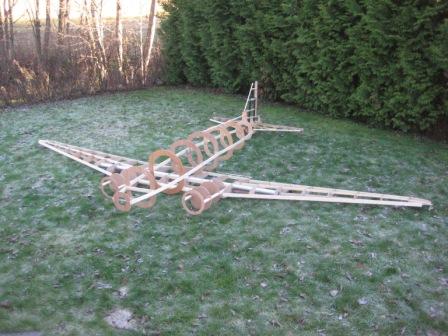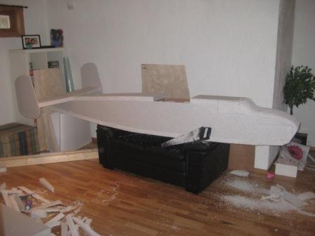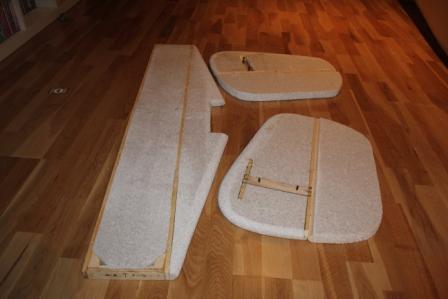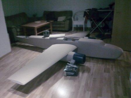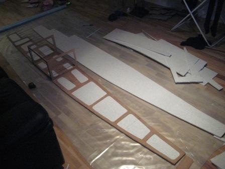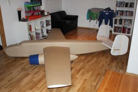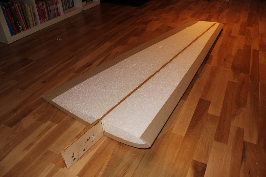 vingen. Fikk vingene etter kort tid og det så veldig bra ut. Hadde en del kryssfiner 1 mm til overs fra DC3 prosjektet, brukte dette til planking av vinge. Da kom Carl Thomas (flis) og sa; hør nå her, dette må vakumbagges og det er lett. Vi laget bag av byggplast og sølvtape, koblet på er kjøleskap motor/agregat (den suger vakum). Det så perfekt ut, sugde plankingen fint rundt isopor kjernen. Da var det bare å vente på limet skulle tørke ca 8 timer. Sjekket innom etter en time, ting så da ikke så bra ut lenger
