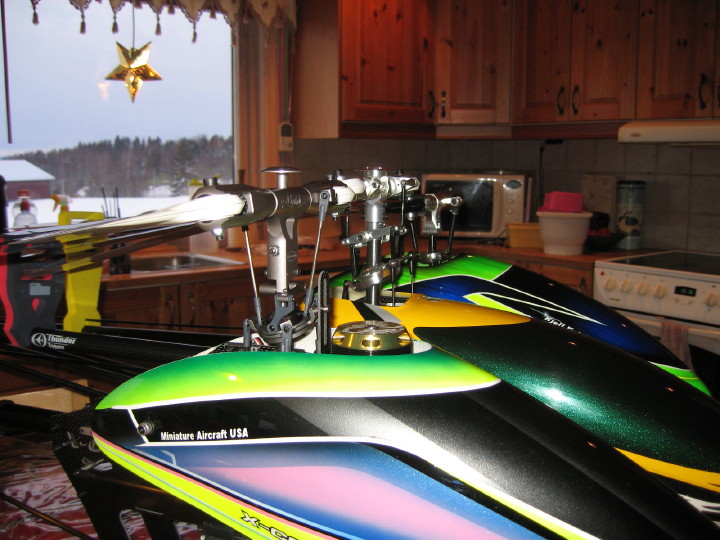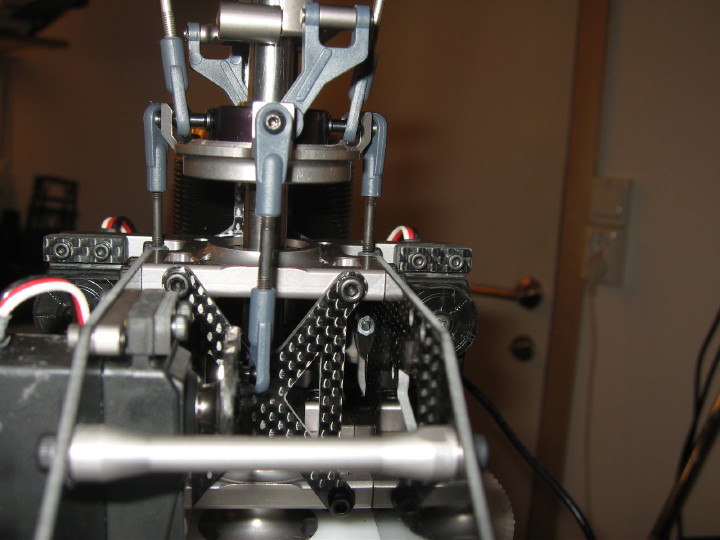 Men når jeg gikk videre med oppsettet fikk jeg store problemer med bindinger i hodet. Jeg så ikke med en gang hva som buttet, men etter hvert fant jeg ut at det var innerringen på swash'en som buttet i masta. I tillegg buttet antirotasjonspinnen på swash'en i nerkant av antirotasjonsbraketten ved for elevator. Og den buttet tidlig. Jeg begynte å undersøke litt og spørre andre Whiplash eiere på RunRyder. Jeg fikk bekreftet at mine linkelengder og andre mål jeg sjekket skulle være riktige. Ellers var det ikke mye hjelp å få. Men jeg fikk og vite at det ikke ville være mulig å komme innenfor de anbefalte verdiene på V-bar med geometrien som er i Whiplash hodet.