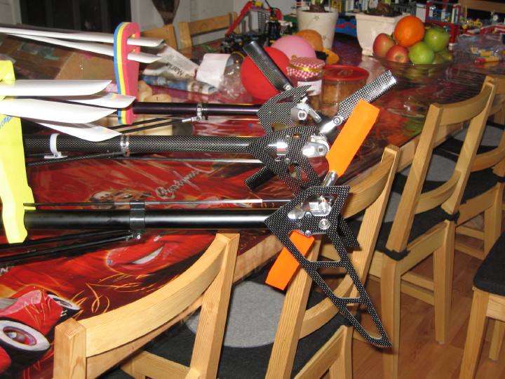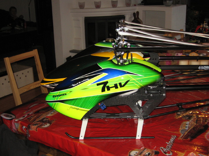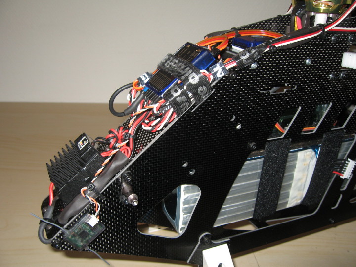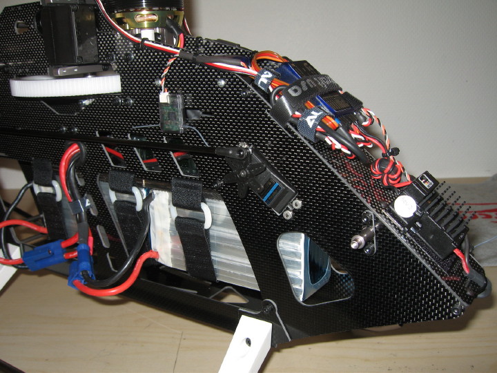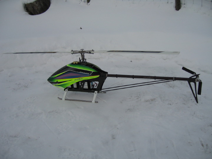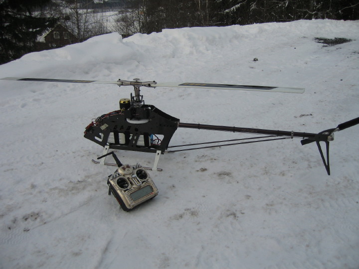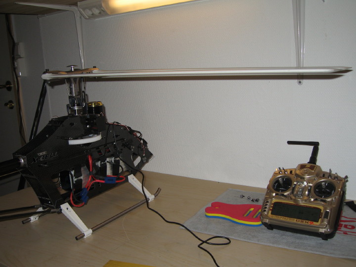 Ja, nå er det lenge siden det har skjedd noe her. Etter juleferien var over ble det liksom bråslutt på ledig tid. Men litt har jeg nå fått gjort da. Jeg sjekket CG straks heli var ferdig montert. Den viste seg å være litt baktung. Batteriene gikk ikke lenger frem pga de butter i hale servoen. Var egentlig forberedt på dette, og tror jeg nevnte en del om dette over her. Det finnes mengder av forslag for å fikse dette. Men min løsning ble å bygge oppunder batteriet for og senke det ca 10mm for å gå klar av servoen. Jeg hadde ikke noe som egnet seg spesielt så jeg endte med å lage en liten nedforing av finer.