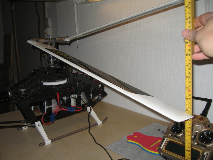 Da jeg begynte med V-bar oppsettet møtte jeg litt motstand. Jeg sjekker 0 grader pitch ved å folde bladene. De hadde ganske mye negativ pitch som jeg korrigerte ved å forlenge linkene fra swash til bladgripere. Så langt alt vel. Resten av oppsettet gjorde jeg med standard pitchmåler.