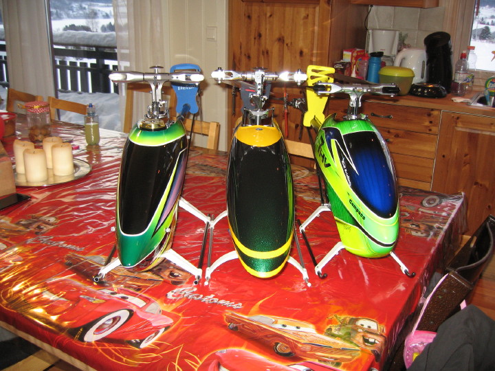 Vi måtte jo fram med vekta. Modellene var ganske likt satt opp. Wihplash med Scorpion 4525-520LE, og de to andre med Align 530kv. Alle tre modellene var med CC ICE2 120 HV, og alle var med CC ProBEC og uten mottakerbatterier. Whiplash'en med V-bar (full-size) og de to andre med ACE RC GT5. Resultatene ble som følger: