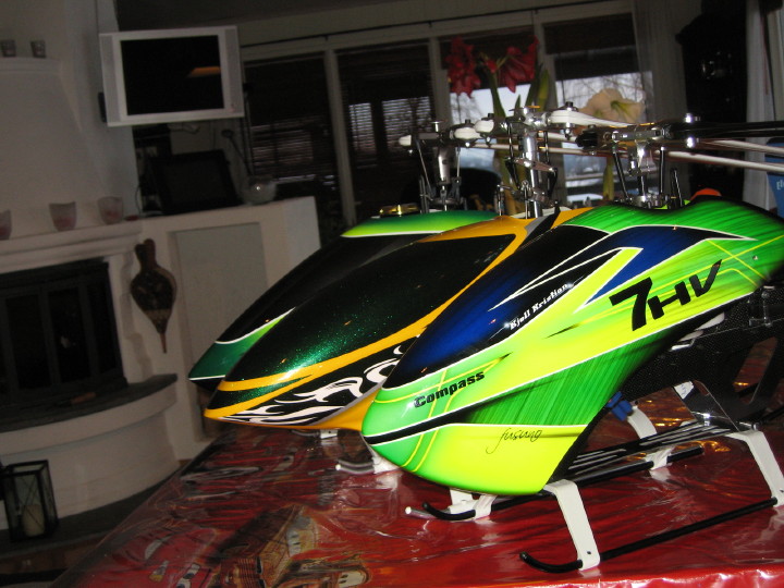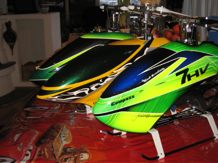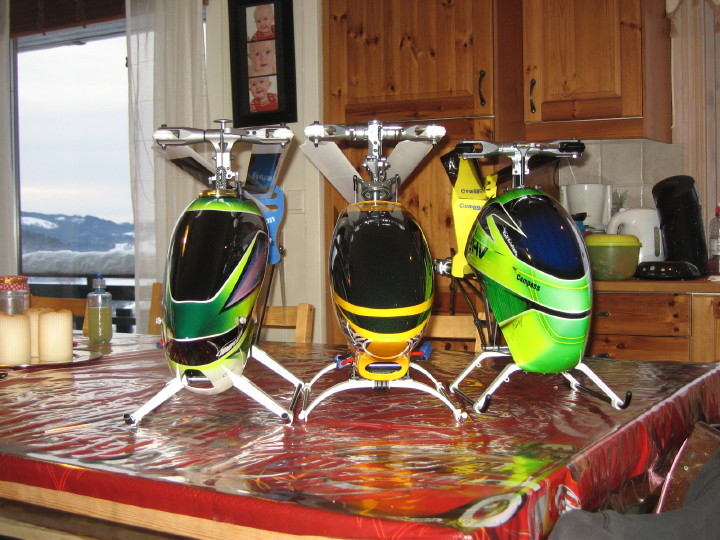 Det var spørsmål om å sammenlikne størrelsen mot andre modeller. Så etter flyging var det jo naturlig å fikse dette. Modellene vi hadde for hånden var nye TT Raptor G4, Compass 7HV og så selvsagt Whiplash 90E. Vi kunne ikke akkurat si at noen av modellene utmerket seg som noe større enn andre. Raptoren hadde lengst hale når alle modellene var linet opp langs mastene. Whiplashen hadde kortest hale. Raptoren og Whiplashen var like høye (sett på blagriperne), mens 7HV'en var en del lavere. Men som sagt, disse fremstår som akkurat like store alle tre.